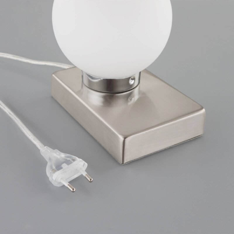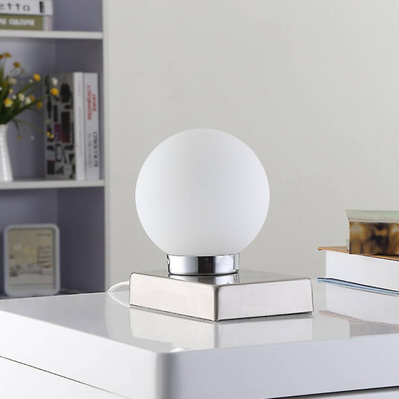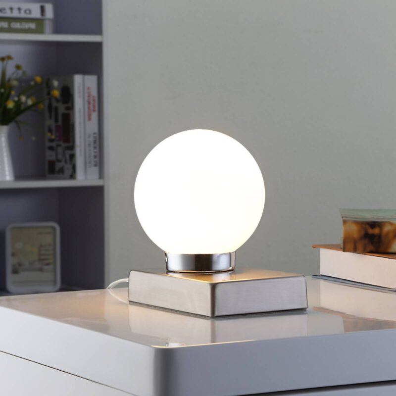 Moderné stolové svietidlo Naomi s bielou opálovou sklenenou guľou Vďaka obdĺžnikovému plochému podstavcu, ktorý je tu spojený s malou bielou guľou, pozorovateľ rýchlo získa dojem, že Naomi je moderné stolové svietidlo. V obytnom priestore sa dá umiestniť rôznymi spôsobmi a hodí sa aj na nočný stolík v spálni, pričom guľa z opálového skla zaisťuje rovnomerný rozptyl svetla s príjemným nádychom. Svietidlo nie je vybavené bežným spínačom, ale má integrovanú dotykovú funkciu: Keď ho chcete zapnúť alebo vypnúť, stačí sa krátko dotknúť jeho podstavca a stolové svietidlo sa hneď rozsvieti alebo zhasne.