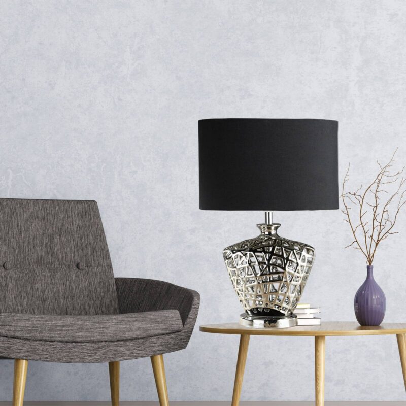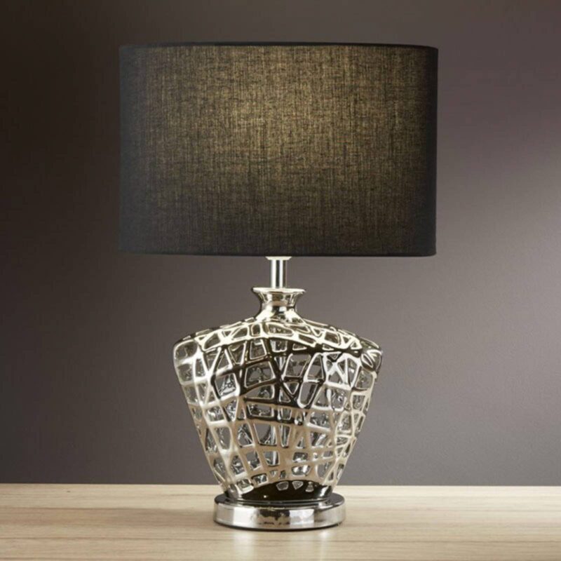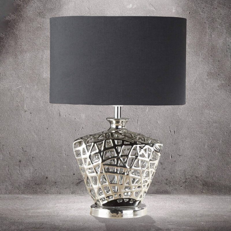 Štýlová stolová lampa Network s čiernym textilným tienidlom Elegantná a štýlová stolová lampa Network má čierne textilné tienidlo. Dopĺňa to špeciálny podstavec žiarovky vyrobený z pochrómovanej keramiky. Cibuľový rám, ktorý je veľmi otvorený a vzdušný, a preto je dekoratívnym pútačom, vyzerá ako jedinečná sieťovina. Stolová lampa Network je preto vhodná ako cielený dekoratívny predmet a ako doplnkový zdroj svetla, ktorý vo večerných hodinách šíri útulné a príjemné svetlo. Táto elegantná lampa, umiestnená na komode, príručnom stolíku, príborníku alebo dokonca na parapete, zaručene priláka každú pozornosť.