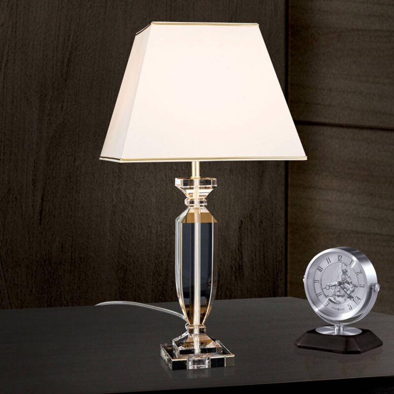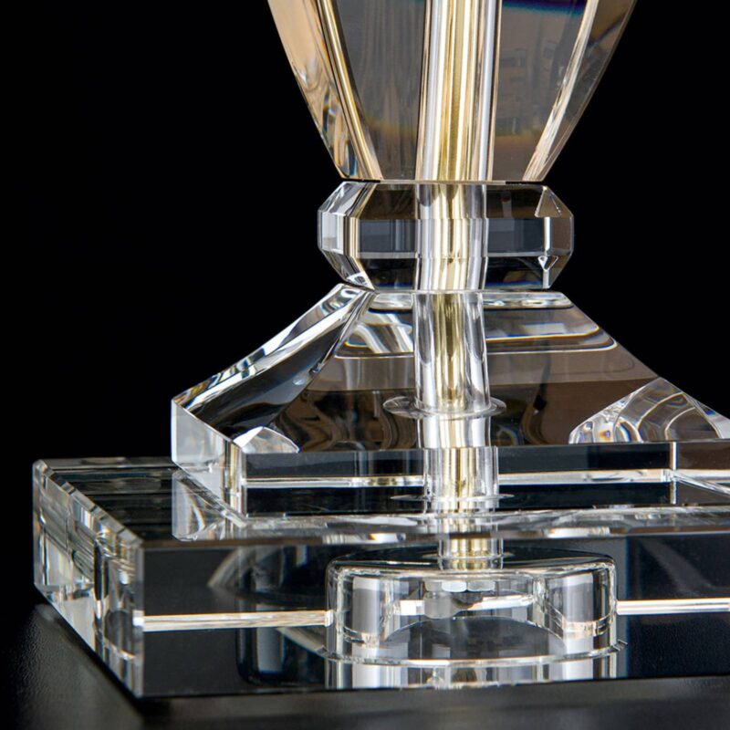 Noblesne navrhnutá stolová lampa Pokal s látkovým tienidlom a kryštálom K9 Pokal sa prezentuje ako ušľachtilý doplnok sofistikovaného interiérového dizajnu a poskytuje veľmi útulné doplnkové osvetlenie v obývacích izbách a spálňach. Aj keď nie je osvetlený, priťahuje pozornosť svojím exkluzívnym dizajnom. Základ stolovej lampy Pokal tvorí oceľová tyč lakovaná zlatou farbou, na ktorej je umiestnené hranaté látkové tienidlo krémovej farby so zlatým lemom na spodnom okraji. Tenká kovová tyčinka je celá zaliata v priehľadnom kryštáli K9. Prepínač, kábel a zástrčka sú tiež priehľadné. Výsledkom je filigránsky celkový dojem, ktorý podčiarkuje exkluzivitu značky Pokal.
