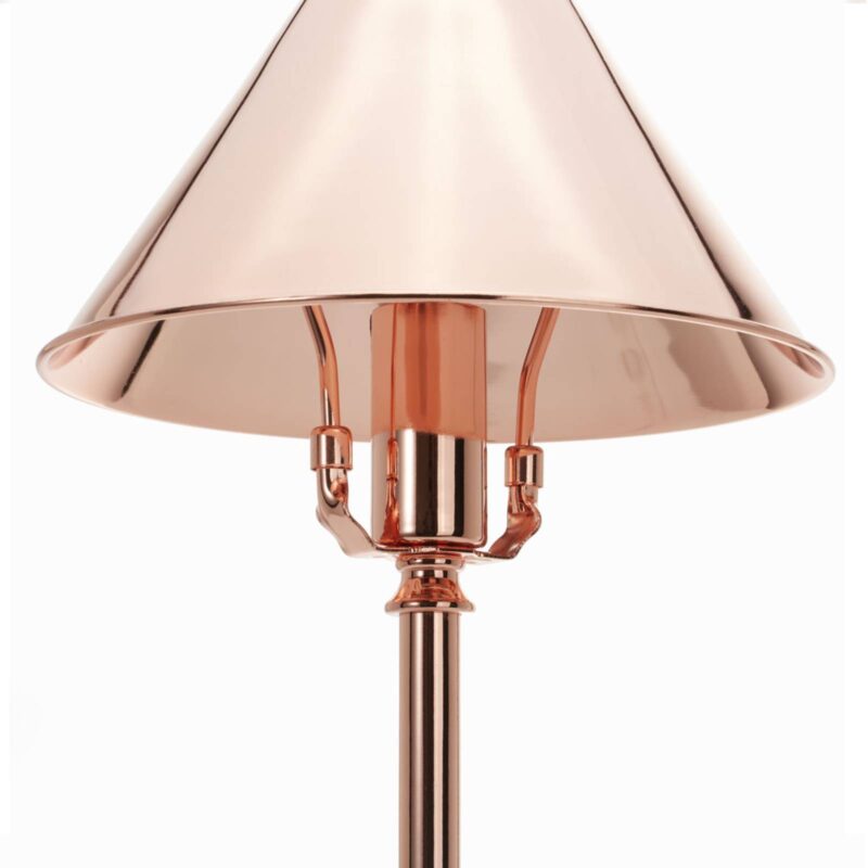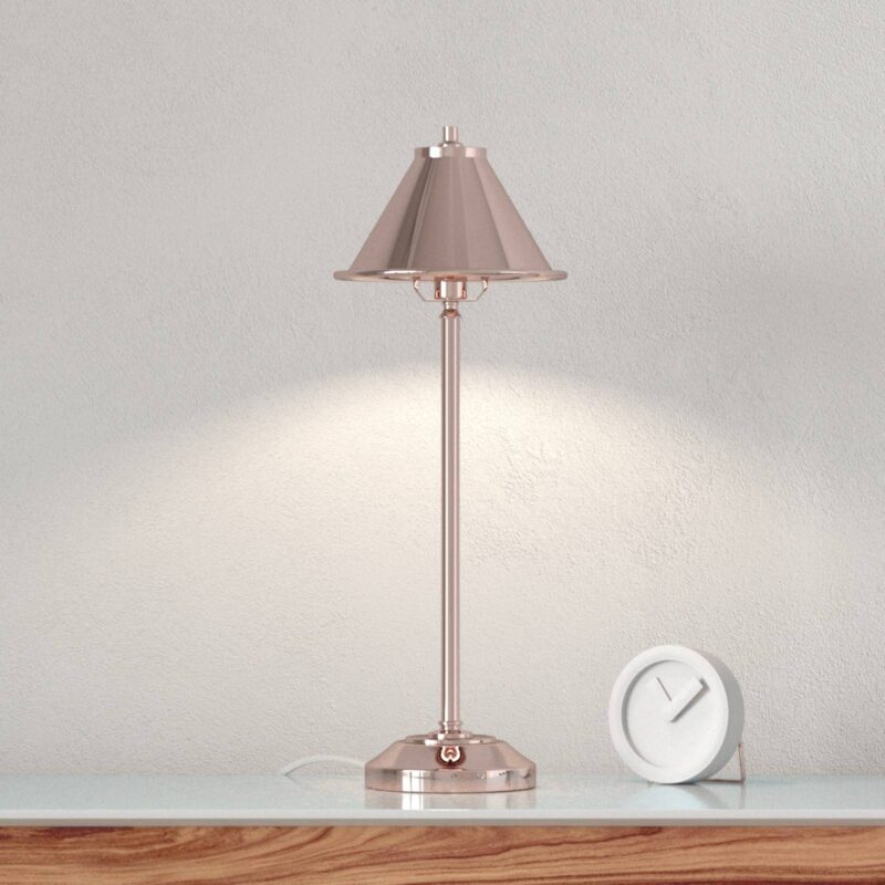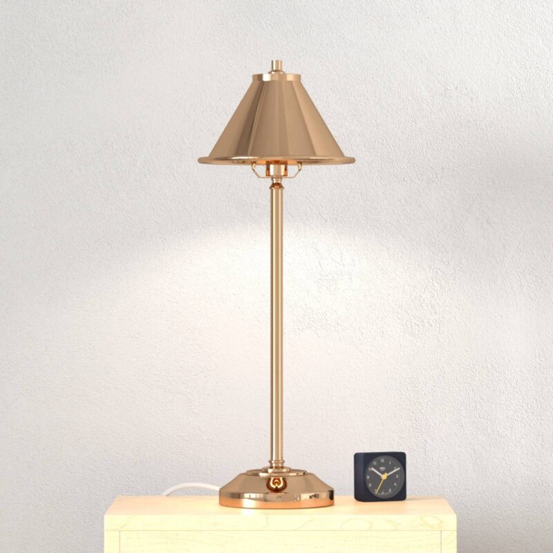 Lesklá medená stolová lampa Provensálsko s priemyselným šarmom Stolová lampa Provence zaujme nielen svojím úžasne štýlovým a priemyselne vyzerajúcim dizajnom, ale aj príjemným svetelným efektom bez oslnenia. Za poslednú uvedenú zodpovedá tienidlo na lampu vyrobené z kovu, ktoré sedí na úzkej štíhlej tyči, ktorá je zase pripevnená k okrúhlemu stojanu, ktorý rovnako ako zvyšok svieti svetlom v medenej farbe ladenej do šperkov. Svetlo je úžasne nepriamo odvádzané do miestnosti cez kužeľovitý tienidlo na lampu smerom nahor, takže vzniká skvelá atmosféra. Okrem toho, že je lampa použitá ako nočná lampa, je vhodná aj ako dodatočný atmosférický zdroj svetla do mnohých ďalších miestností v dome.