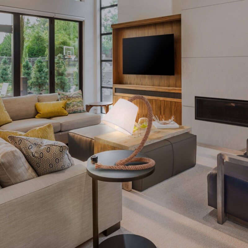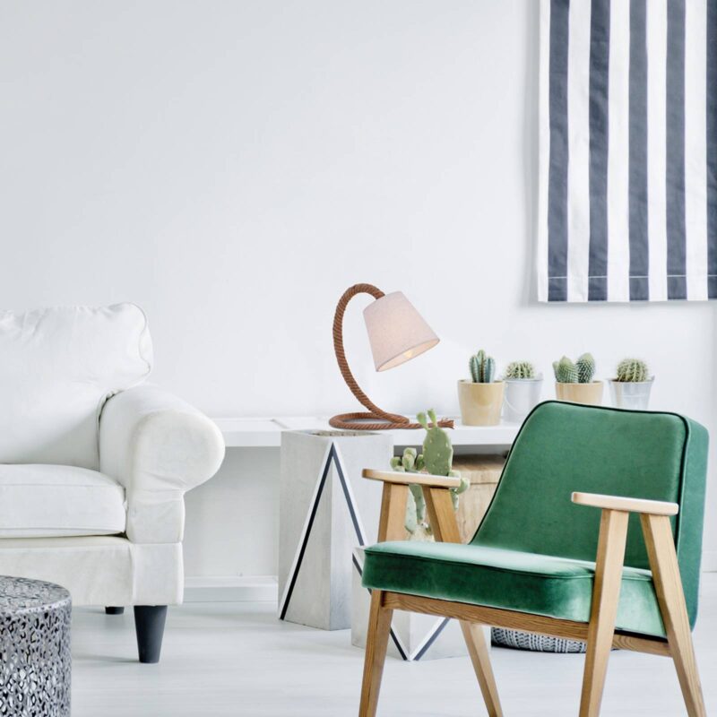 Stolová lampa Rope s prírodným dizajnomPrírodné lano vinúce sa smerom nahor a k nemu pripevnené textilné tienidlo v prírodnom odtieni tvoria dizajn stolovej lampy Rope, ktorá je neprehliadnuteľným pútačom pozornosti v obývacej izbe. Tienidlo obsahuje svetelný zdroj E14, ktorý vyžaruje svetlo nielen cez otvor tienidla, ale aj cez textíliu, takže sa vytvára mäkké a neoslňujúce okolité osvetlenie. S prepínačom.