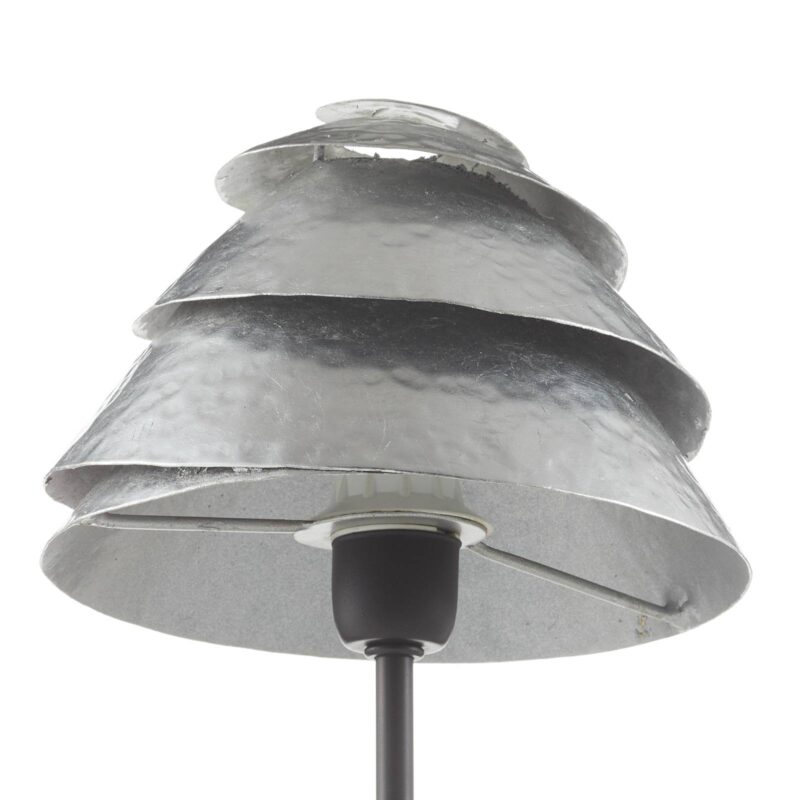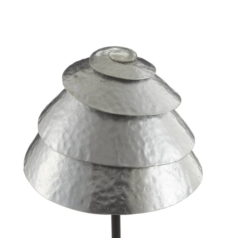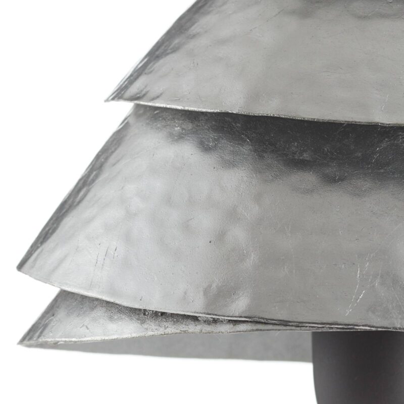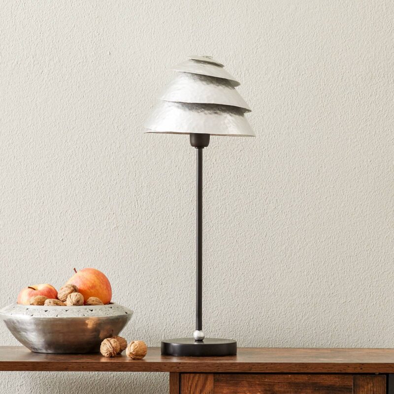 Stolná lampa v tvare klobúka Slimák One so štruktúrouStolná lampa pozostáva z kovového tienidla z intenzívne opracovaného železného pásu s povrchovou štruktúrou. Štruktúra akoby pochádzala z úderov kladiva a zanecháva na nej vzor jamiek. Skrútený pás pripomína klobúčik huby alebo akúsi ulitu slimáka. Toto tienidlo sa nachádza na hnedočiernom podstavci lampy a diskrétne osvetľuje priestor medzi stuhami a pod lampou.