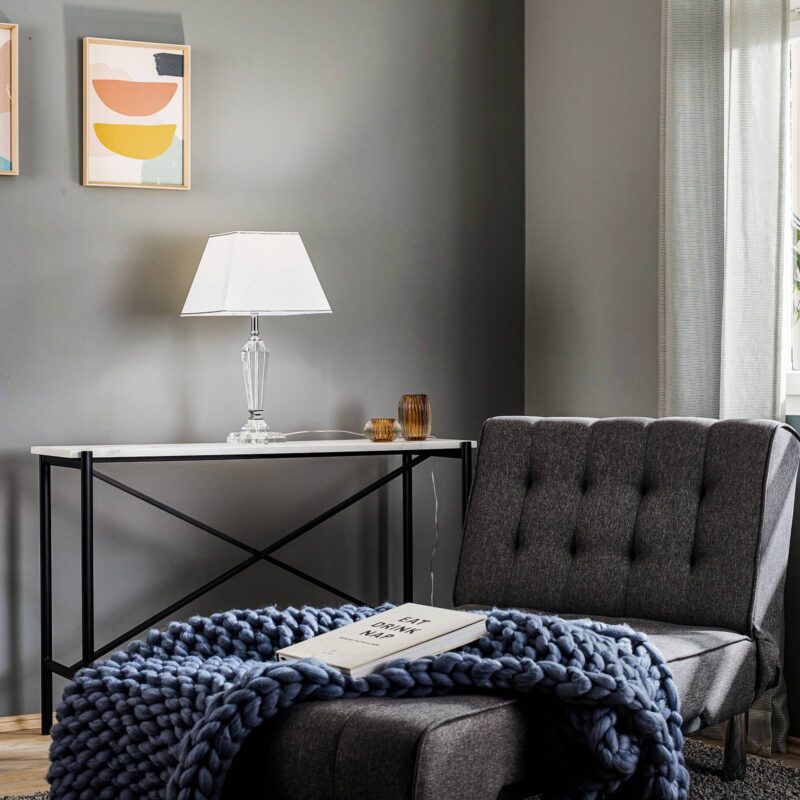 Biela stolová lampa Veronique s podložkou z brúseného krištáľu Stolová lampa Veronique je vybavená bielym chintzovým tienidlom, ktoré je vylepšené jemnými striebornými šnúrkami na hornom a dolnom okraji. Dizajn kombinuje jednoduché látkové tienidlo s podstavcom vo forme svietnika z jemného, brúseného krištáľového skla K9, ktoré je zušľachtené dvoma kovovými prvkami chrómu. Aktiváciou lampy sa dokonca aj základňa z krištáľu mierne rozžiari, čo z tejto lampy určite robí pútavý pohľad. Pre voľne nastaviteľný zdroj svetla sa odporúča teplé biele pohodlné svetlo. Spínač je umiestnený na napájacom vedení.