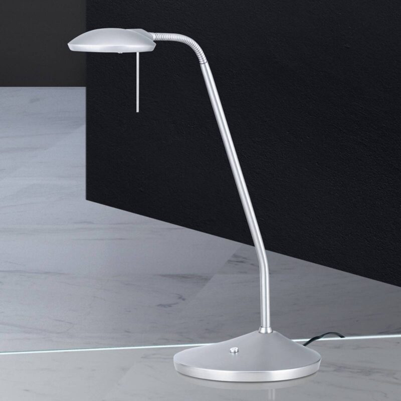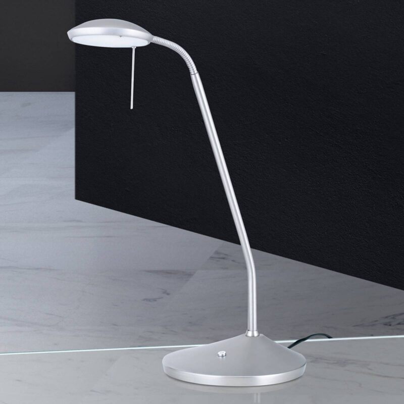 Stolná LED lampa Cobra – eso z hľadiska vzhľadu a funkčnosti Vzhľad stolnej LED lampy Cobra s matným niklovým povrchom sa vyznačuje nadčasovou krásou, takže radosť z tohto pohodlného zdroja svetla vám vydrží dlho. Cobra je vybavená tzv. husím krkom, t. j. flexibilným ramenom, ktoré zabezpečuje nastaviteľnosť hlavy svietidla. Okrem toho je možné pomocou tlačidlového spínača plynule regulovať intenzitu a farbu svetla. Nastaviteľná farba svetla sa pohybuje od teplej bielej (2 200 K) po denné svetlo (6 000 K).