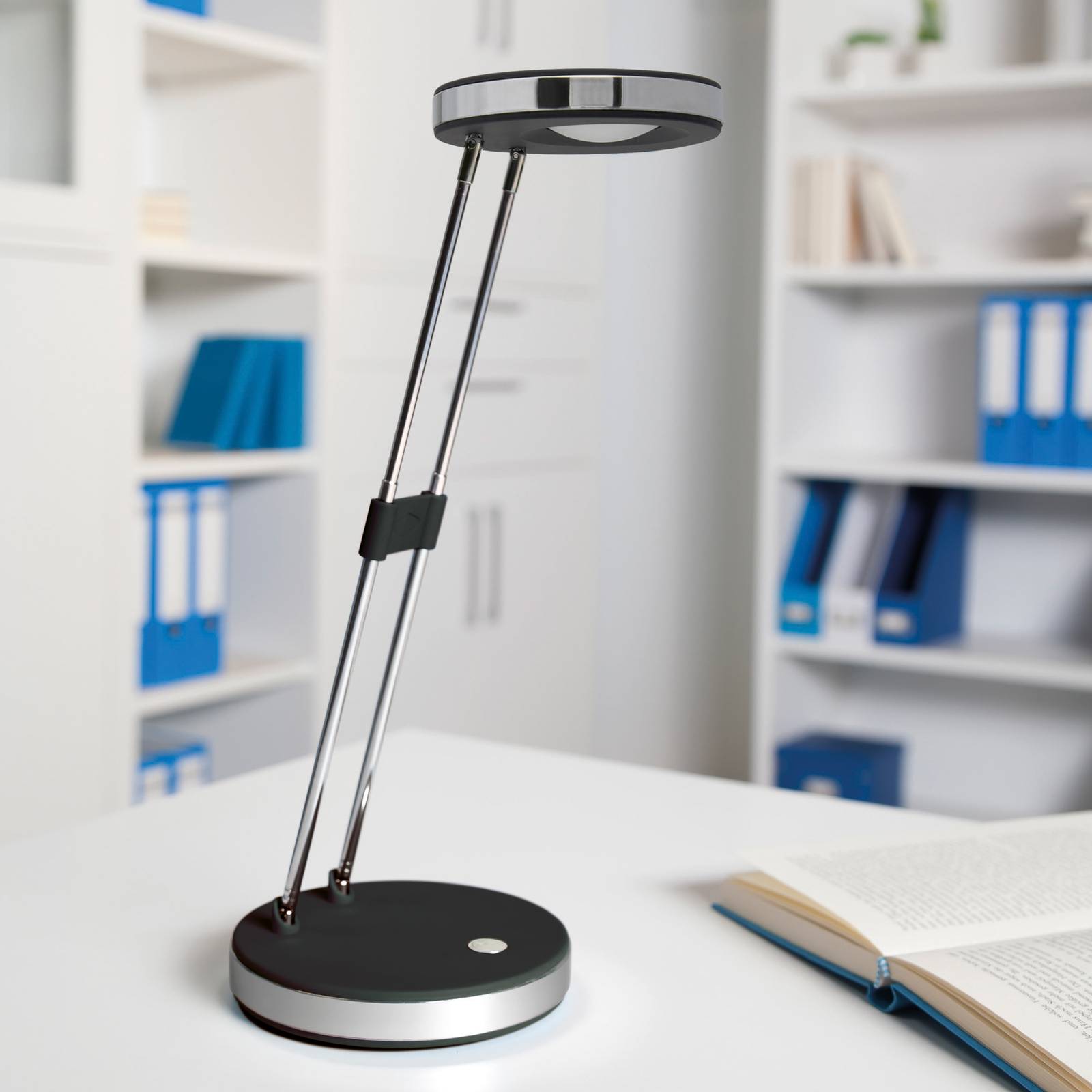 Stolná LED lampa MAULpuck s pohodlným dvojitým teleskopickým ramenom MAULpuck je veľmi praktický, priestorovo úsporný a energeticky efektívny zdroj svetla, ktorý možno použiť na optimalizáciu svetelných podmienok, napríklad na pracovnom stole, podľa individuálnych požiadaviek. Dvojité teleskopické rameno sa dá vysunúť z 18,5 cm na maximálne 33 cm a hlavu a rameno stolnej lampy možno otáčať. Vďaka tomu je možné veľmi jednoducho nastaviť smer svetla podľa potreby. Vďaka svojmu praktickému dizajnu zaberá MAULpuck veľmi málo miesta. Dá sa tiež zložiť, aby sa dala ľahko prenášať v aktovke alebo uložiť do zásuvky. Integrovaný difúzor zabezpečuje, že lampa vrhá len málo tieňa. Stolná LED lampa MAULpuck je stabilná vďaka záťažovej vložke v základni, ktorá je vybavená aj podložkou na ochranu stola – Vypínač zabudovaný v základni lampy