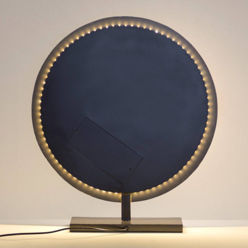 Planet – stolová LED lampa so skvelým svetelným efektom Okrúhla stolová LED lampa Planet vyzerá ako dve planéty, ktoré sa posúvajú po sebe. Za okrúhlou doskou z čiernohnedého železa sú po celom obvode, ako aj v okrúhlej priehlbine nainštalované LED diódy. Jedinečný svetelný efekt nevytvárajú len LED diódy s veľmi teplou farbou svetla 2 700 K – LED diódy vo výklenku, ktoré svietia teplou bielou farbou svetla (3 000 K), dávajú veľmi výrazne vyniknúť zlatistému štruktúrovanému interiéru svietidla. Na rozdiel od tienidla stolnej lampy Planet LED je podstavec navrhnutý veľmi jednoducho a má hranatý tvar. Táto expresívna stolová LED lampa je nielen pútačom pohľadov, keď je zapnutá, ale s priemerom disku 50 cm je aj ozdobou, keď je vypnutá.