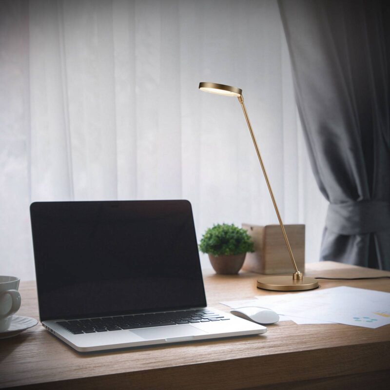 Stolná LED lampa Thea-T – praktický zdroj svetla na stôl na čítanie Táto stolná LED lampa má puristický dizajn. Mierne sklonené rameno sa tiahne od okrúhlej základne v priamej línii k hlavici lampy. Jeho okrúhla plocha je v spodnej časti vybavená LED diódami. V hlavici je integrovaný snímač, ktorý sa používa na ovládanie gestami. Pomocou neho možno svetlo zapnúť a vypnúť krátkym pohybom ruky. K dispozícii je aj funkcia stmievania, ktorá sa ovláda dlhším podržaním ruky.