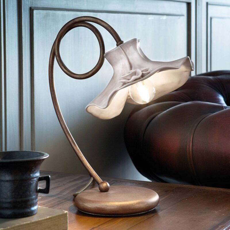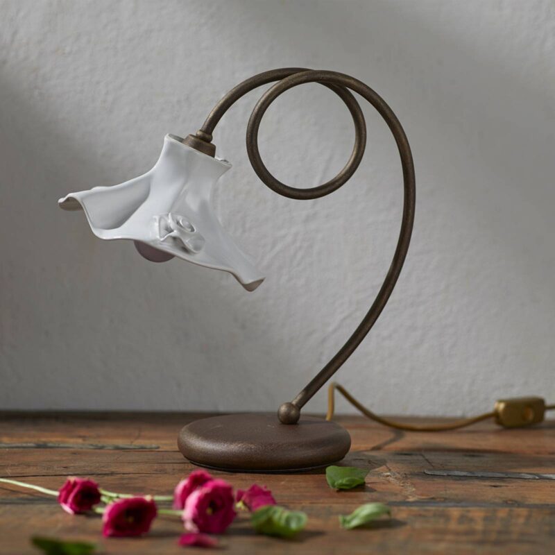 Hravá stolová lampa Eleonora s keramickými aplikáciami Stolová lampa Eleonora je umelecky tvarované svetlo. Lampa žiari svojimi všestrannými možnosťami použitia, najmä ako osvetlenie na stôl, ale aj na nočný stolík alebo jednoducho umiestnená v miestnosti. Nezáleží na tom, či má zariadenie klasický vzhľad vidieckeho domu, alebo prevláda modernejšie zariadenie. Svetlo vždy dokáže splynúť s okolím, a to aj ako dekoratívny predmet. Dôvodom je jeho výrazný tvar. Rám je veľmi atraktívne zakrivený a má očarujúci uzol. Dômyselne navrhnuté tienidlo je nádherným doplnkom. Nielen tvar, ale aj drobné, detailné aplikácie vytvárajú príjemnú formu. Celé to dotvára veľmi príjemná farebnosť. Hrdzavohnedá farba rámu veľmi dobre dopĺňa bielu farbu tienidla. Celkový efekt je klasická lampa.