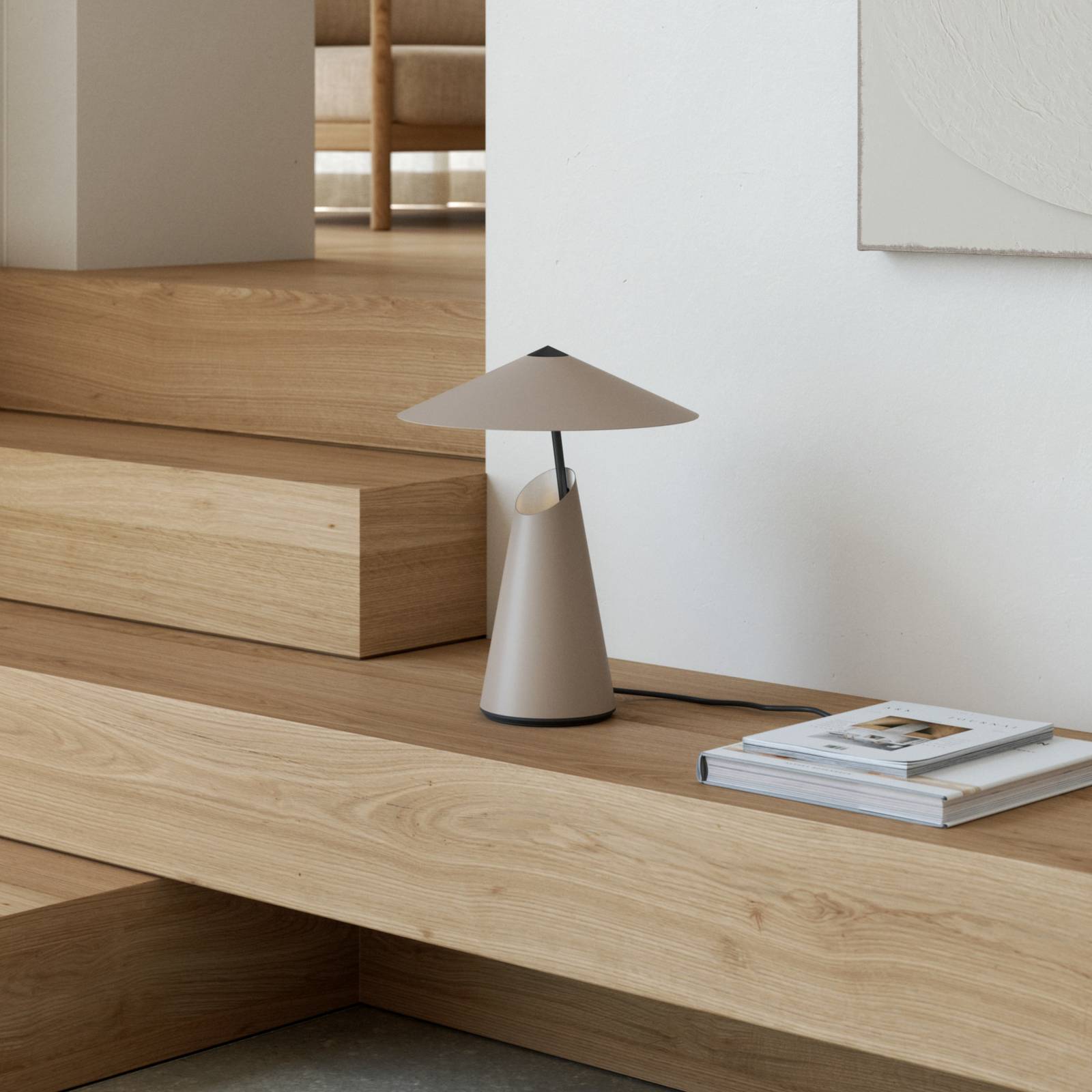Neobyčajná stolová lampa z kovu – Taido od Anker Studio Elegantná stolová lampa Taido je výsledkom nápadov dizajnérskeho dua stojaceho za Anker Studio. Jej osobitý tvar ju okamžite dostáva do centra pozornosti. Z kužeľovitého podstavca vyrastá jemná, štíhla tyč, ktorá prechádza do plochého, okrúhleho tienidla na lampu, ktoré sa smerom nahor zužuje a je zdobené čiernym detailom. Tienidlo na lampu je možné nakloniť, čím je možné ovplyvniť smer vyžarovaného svetla. Svetelný zdroj je skrytý v podstavci a svieti z kužeľa priamo na spodnú stranu tienidla na lampu.