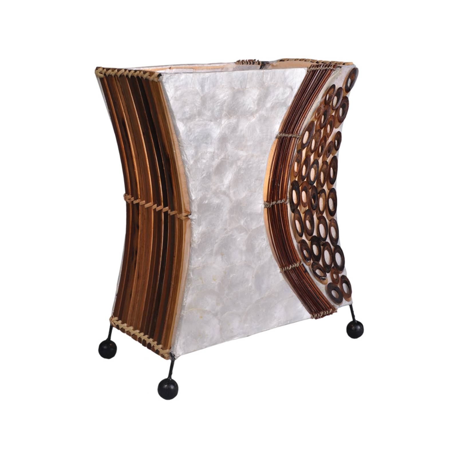 Ručne vyrobená stolová lampa Wayan z Bali Malá stolová lampa Wayan presvedčí exotickým nádychom, ktorý vytvárajú najmä použité prírodné materiály. Lampa z bielych mušľových diskov a bambusového dekoru v podobe krúžkov a prúžkov je ručne vyrobená na Bali a poskytuje mäkké doplnkové svetlo. Súčasťou dodávky sú 2 m kábla a vypínač.