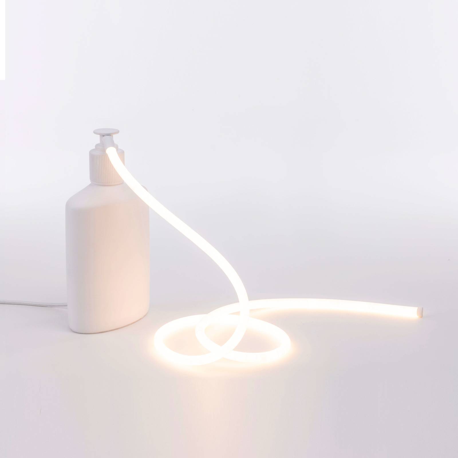 LED dekoratívna lampa Daily Glow v tvare dávkovača mydla so svetelnou trubicou LEDDaily Glow je interiérový dekoratívny doplnok, ktorý predstavuje objekt ručného dávkovača mydla so svietiacimi detailmi. Kompletne bielo navrhnuté dekoračné svietidlo je vyrobené zo syntetickej živice a je vybavené teplou bielou žiariacou LED svetelnou trubicou zo silikónu, ktorá akoby vytekala z vývodu mydla. V tomto vyhotovení je Daily Glow určené na napájanie prostredníctvom zásuvky a je vybavené káblom so zástrčkou, v ktorom sa nachádza aj vypínač