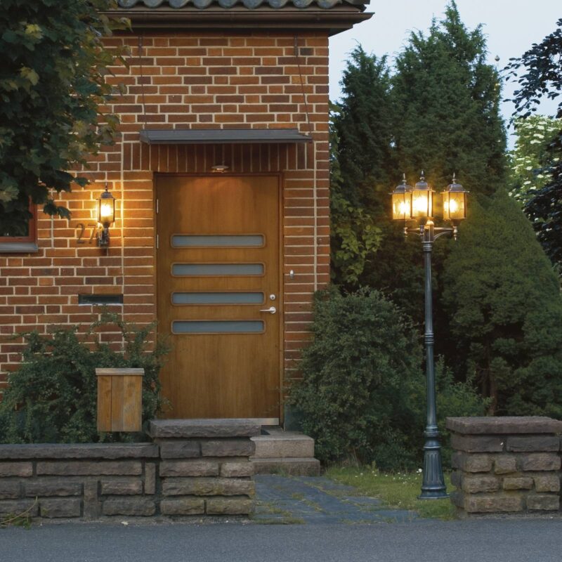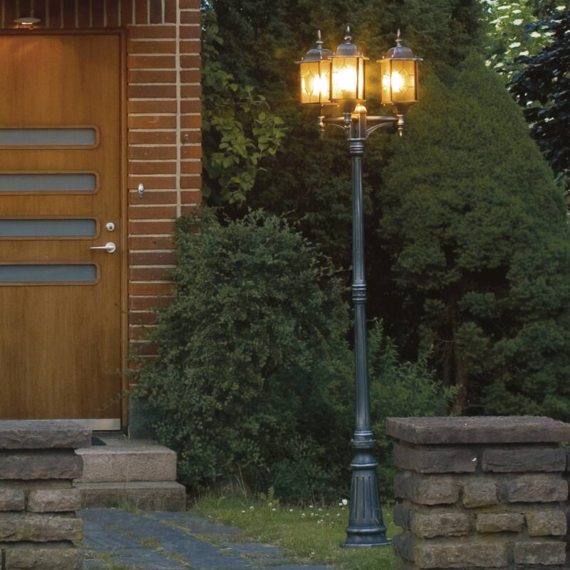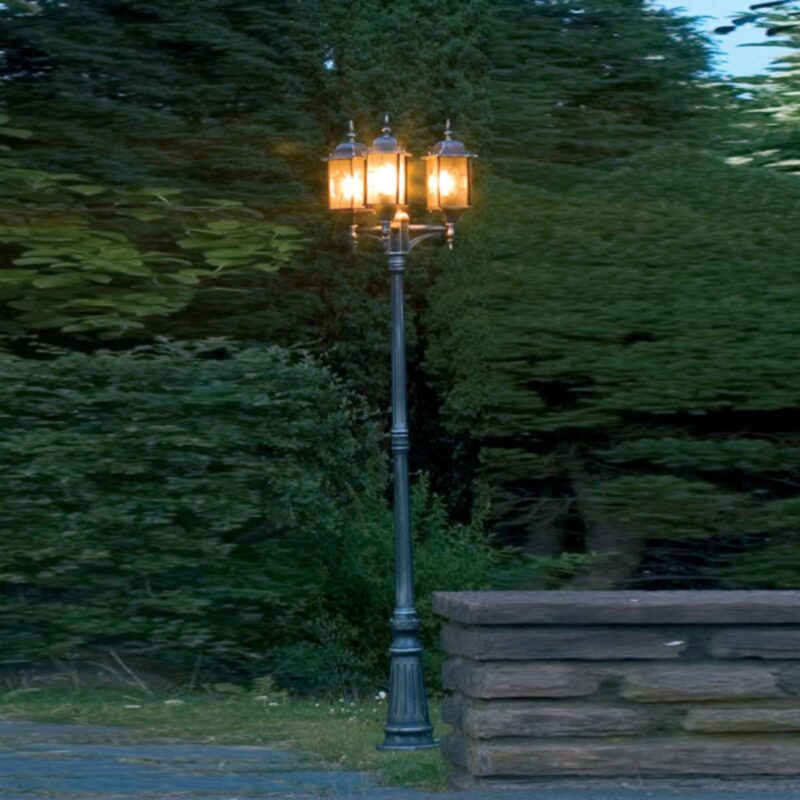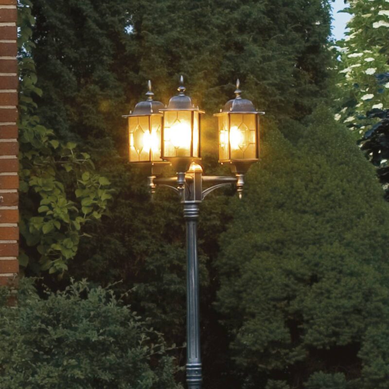 Stožiarové svietidlo MILANO z hliníka, s tromi svetelnými zdrojmi Toto hliníkové stožiarové svietidlo so svojimi tromi svietidlami vyzerá veľmi vznešene vďaka akrylovým sklám v olovnatej krištáľovej optike a dekoráciám na stĺpikoch a lampášoch. Svietidlá sú usporiadané v trojuholníku, a tak zabezpečujú dobré osvetlenie.