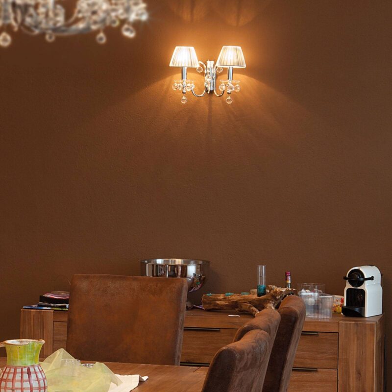 Krištáľové nástenné svietidlo s dvoma žiarovkami a strieborným povrchom Toto pekné nástenné svietidlo osvetľujú dve krásne sviečkové žiarovky a ich svetlo prežaruje číre krištále Swarovski, ktoré visia z lesklého pochrómovaného nástenného držiaka. Textilné tienidlá vytvorené zo strieborných vláken umocňujú atraktívny vzhľad jedinečným svetelným efektom. Krištáľový dizajn nástenného svietidla, ktoré pekne dopĺňa elegantný štýl bývania, je na účely jednoduchšej obsluhy vybavený vypínačom. – ramená svietidla so štvorcovým profilom