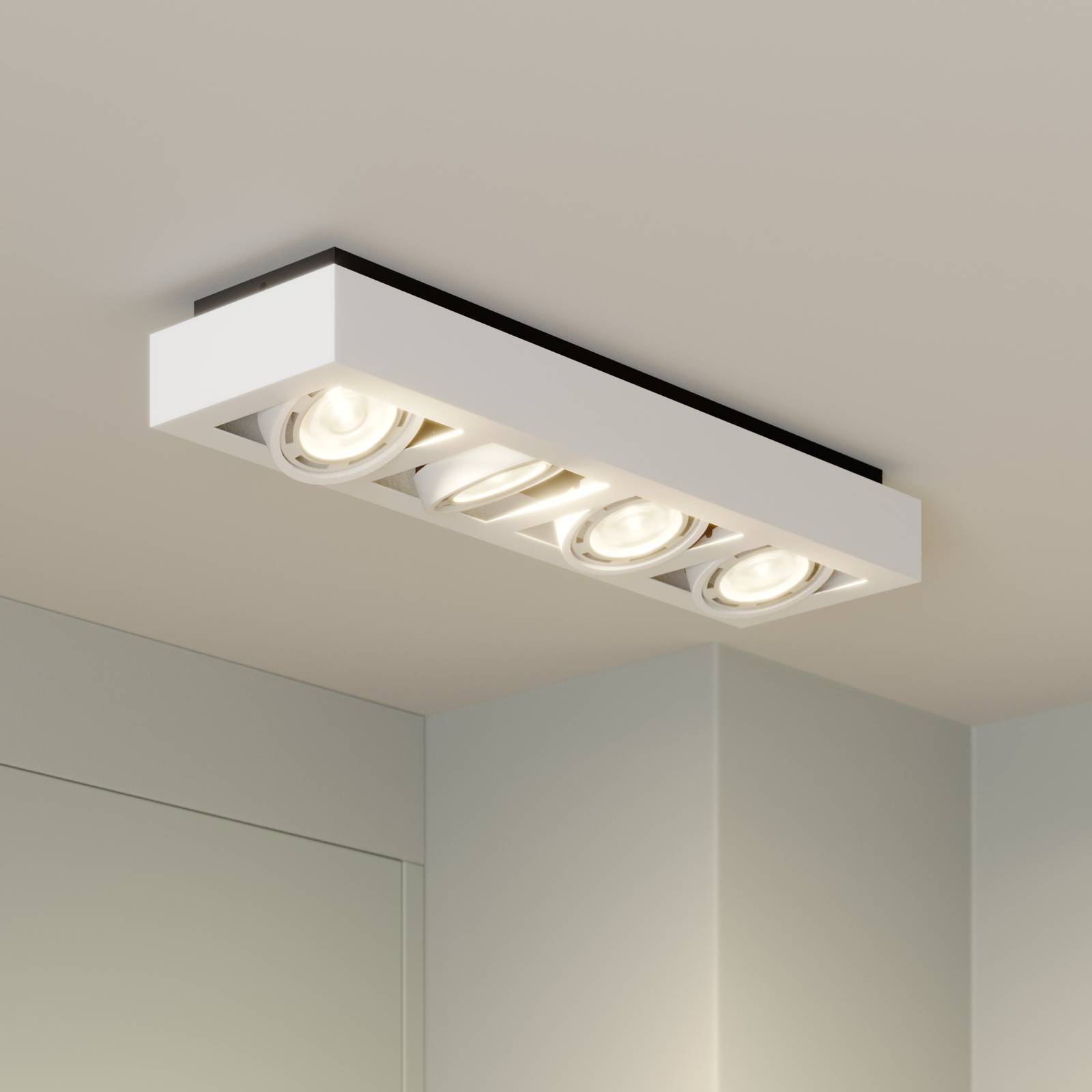 Podlhovasté stropné svietidlo Ronka so štyrmi žiarovkami pre žiarovky GU10 Ronka je vhodné do súkromných priestorov, ako sú kuchyne, chodby a pracovne, aj do komerčných priestorov, kde sa stropné bodové svietidlo môže použiť napríklad ako osvetlenie predajne. Svietidlá možno podľa potreby otáčať, pretože vložky sú pohyblivé, a stropné svietidlo LED je vybavené bezskrutkovou pripojovacou svorkou, ktorá umožňuje rýchlu montáž bez použitia náradia. Biely povrch má príjemne nadčasový vzhľad a celkový vzhľad sa vyznačuje funkčným, minimalistickým vzhľadom.