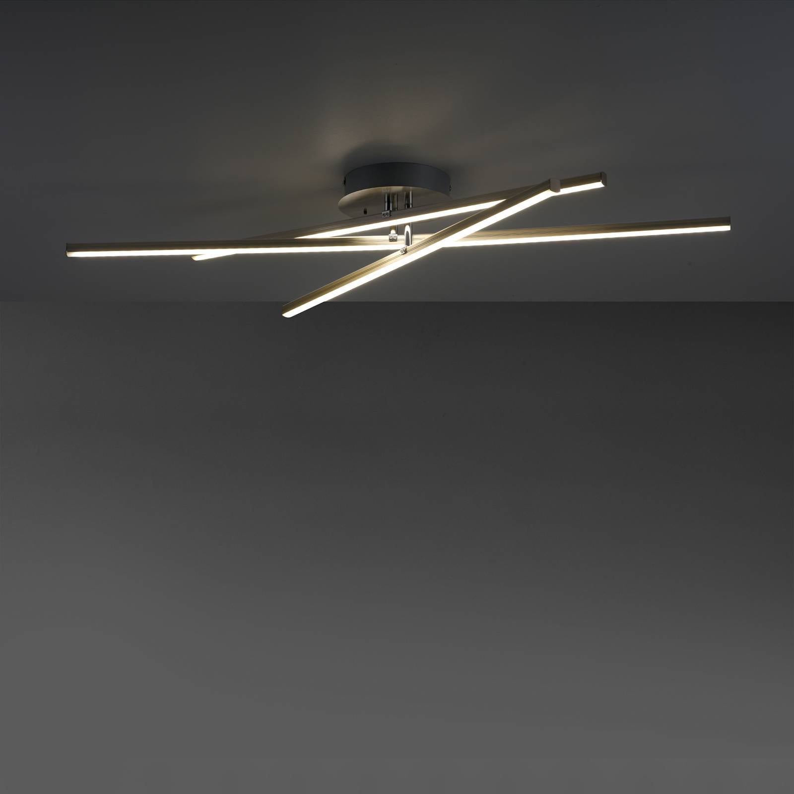 Diaľkovo ovládané stropné svietidlo LED Alina s otočnými svetelnými tyčami S týmto stropným svietidlom LED možno obytný priestor nielen dostatočne osvetliť, ale aj nastaviť určité svetelné nálady. Zabezpečujú to LED pásy pripevnené na otočných svetelných tyčiach, ktoré možno prepínať do rôznych režimov svietenia. Na spodnej strane sú vybavené diódami LED CCT, ktoré vyžarujú svetlo v rôznych farbách od teplej bielej po univerzálnu bielu. Na hornej strane sa nachádzajú LED diódy RGB, ktoré poskytujú farebné okolité svetlo. Pomocou priloženého infračerveného diaľkového ovládača možno vykonať rôzne nastavenia svetla, aby sa atmosféra mohla opakovane meniť a prispôsobovať. Vďaka dvom otočným svetelným tyčiam možno vzhľad moderného stropného svietidla neustále meniť. Špeciálne funkcie – ovládanie pomocou dodaného diaľkového ovládača (vrátane pamäťovej funkcie) – oba zdroje svetla sa dajú zapínať samostatne – digitálna zmena farieb (dynamická alebo konštantná) – Funkcia CCT (farba svetla nastaviteľná od teplej bielej po univerzálnu bielu) – Možnosť výberu 12 predinštalovaných režimov, napríklad prechádzka lesom alebo západ slnka – stmievateľné