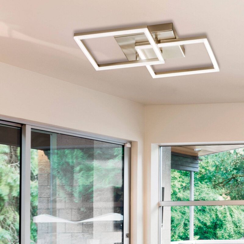 Stropné svetlo Bard LED – jasné a moderné Tento svetelný zdroj je súčasný skrz na skrz. Tvar LED stropného svietidla Bard tvoria tri štvorce – kovový baldachýn s povrchovou úpravou matného zlata a dva prekrývajúce sa rámy. Posledné menované sú na spodnej strane pokryté súvislými svetelnými pruhmi. LED diódy sú stmievateľné a pôsobivo jasné, s maximálnym obsahom viac ako 3 500 lúmenov. Vďaka matným akrylovým krytom je teplé biele svetlo stále bez oslnenia.
