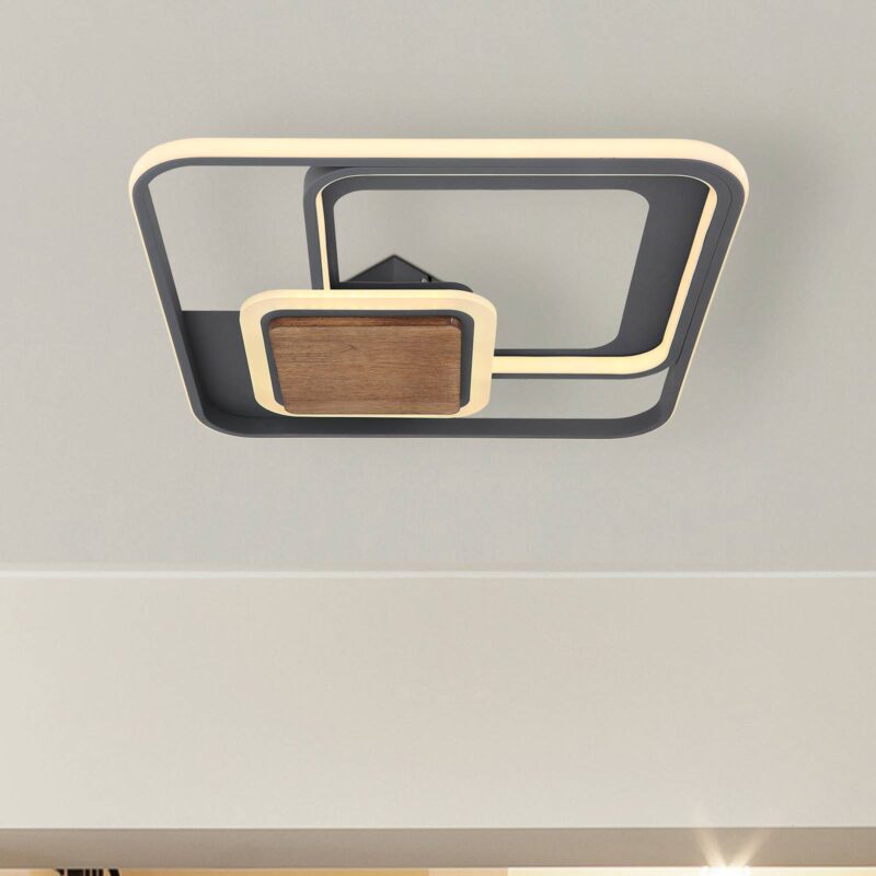 Štvorcové stropné svietidlo LED Nirra zo železa s dreveným prvkom Nirra je nielen moderné stropné svietidlo LED, ale presvedčí aj svojím špeciálnym dizajnom. Skladá sa z troch železných rámov grafitovej farby, ktoré obklopujú rovnako hranatý drevený prvok. Na vnútornej a vonkajšej strane rámov sú pripevnené LED diódy, ktoré vytvárajú teplé biele osvetlenie. Výrazná farebná kombinácia grafitovej farby a tmavého dreva dodáva svietidlu atraktívny farebný kontrast. Stropné svietidlo Nirra LED je ideálne na inštaláciu do chodby alebo obývačky.