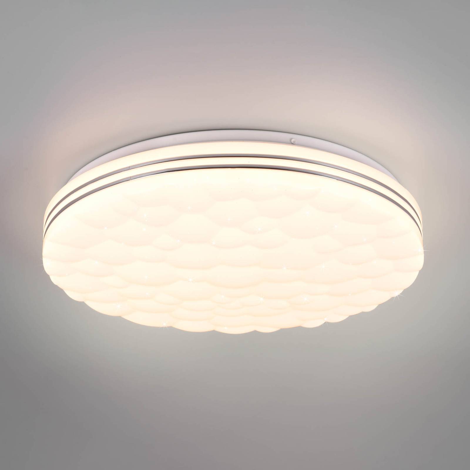 Všestranné nastaviteľné stropné LED svietidlo Tiger – stmievateľné, funkcia RGBW a hviezdicový efekt Stropné LED svietidlo Tiger má jednoduchý okrúhly tvar z bieleho plastu a upúta pozornosť svojou skvelou funkčnosťou. Dodáva sa s diaľkovým ovládaním, ktoré umožňuje reguláciu všetkých nastavení. Jas a teplotu farieb (teplá biela až denné svetlo) možno nastaviť podľa situácie a na dekoratívne osvetlenie možno aktivovať aj farebné svetlo (vrátane dúhového efektu). Početné malé otvory vytvárajú efekt hviezdnej oblohy. V tme možno aktivovať funkciu nočného svetla s diskrétnym svetelným výstupom.