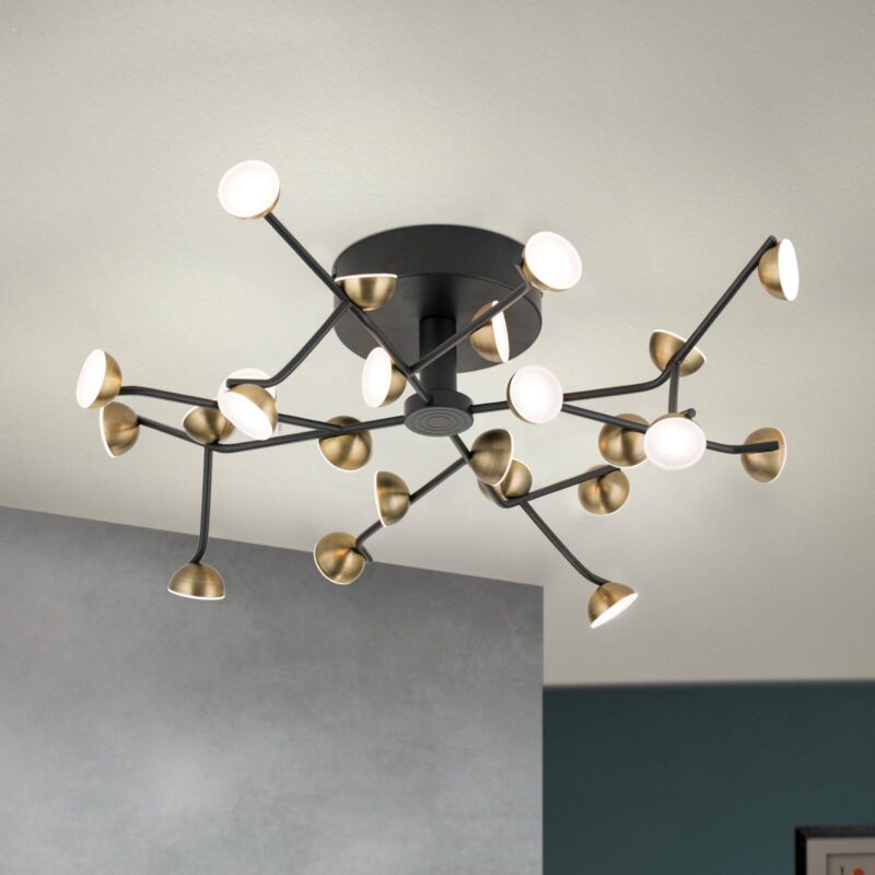 LED stropné svetlo Blossom Stropné svetlo Blossom zaujme svojím individuálnym vzhľadom a mierne rustikálnym pôvabom. Niekoľko tenkých svetelných ramien sa rozvetvuje z tmavého rámu a prúdi do kovových tienidiel zo starožitného zlata, ktoré vyžarujú ich svetlo rôznymi smermi. Konštrukcia stropného svietidla má výhodu v tom, že teplé biele svetlo je rovnomerne rozmiestnené a nezavádza sa na diváka. Čierny lak ramien lampy a zlato tienidla sú štýlovo kombinované a vytvárajú miestnosť veľmi príjemnou. Vďaka svojmu pôsobivému tvaru sa táto lampa stáva absolútnym ústredným bodom. Vďaka veľmi vysokému svetelnému toku je Blossom veľmi vhodný aj na osvetlenie veľkých verejných priestorov.