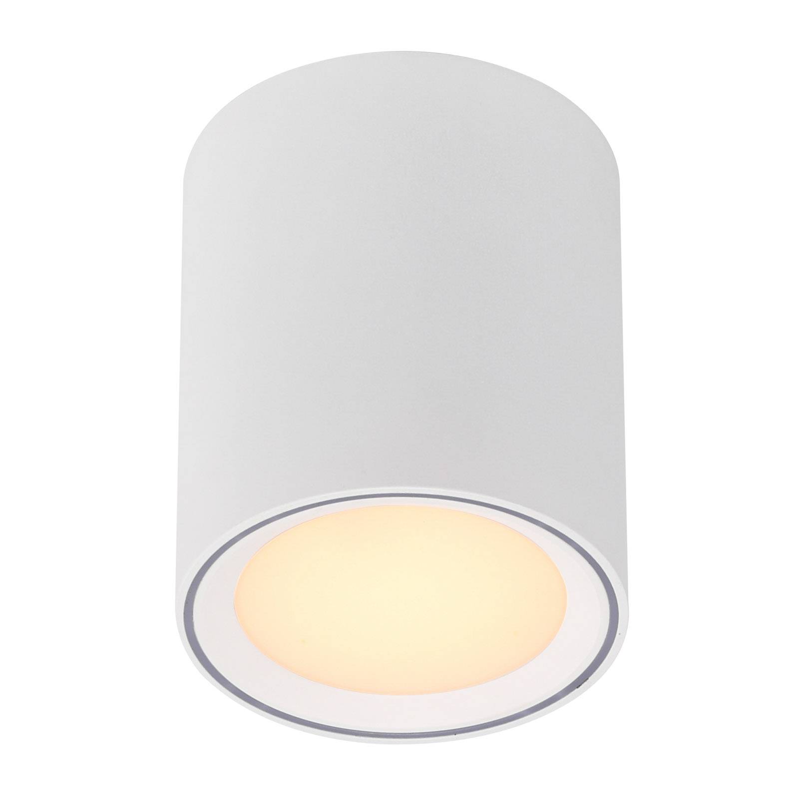 Stropné LED svetlo Fallon v tvare guľatého valca Stropné LED svetlo Fallon sa vďaka svojmu decentnému vzhľadu, ktorý je dosiahnutý bielym kovovým valcom s kruhovým plastovým difúzorom, dá nenápadne integrovať do mnohých interiérov. Teplá biela biele svetlo LED diód je vyžarované pod uhlom 110° smerom nadol. Funkčným highlightom je funkcia MoodMaker™. Vďaka nej je možné pomocou nástenného vypínača zapnúť všetky LED diódy, vnútornú časť s 100 % alebo 50 % svetelným výkonom alebo len vonkajšiu časť.