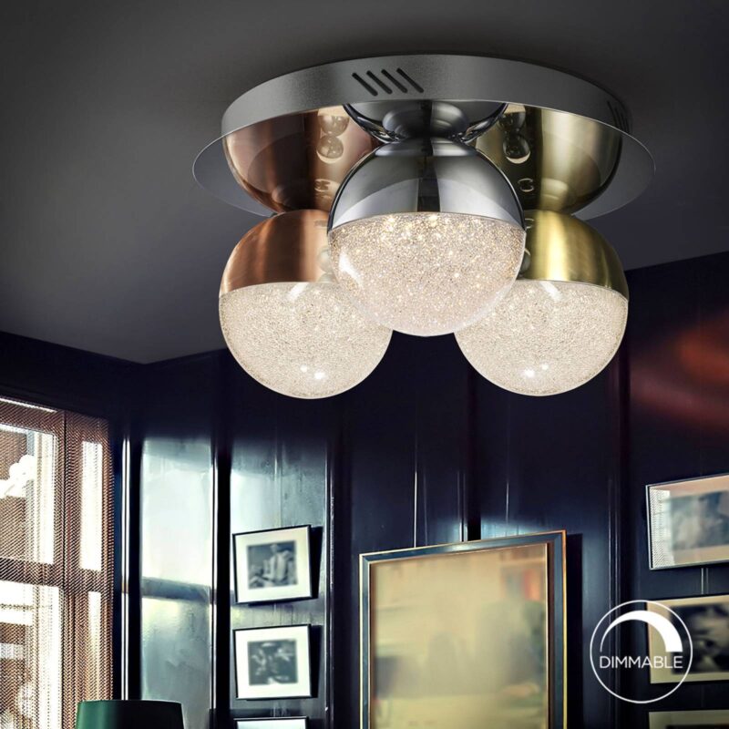 Geniálne navrhnuté stropné svietidlo Sphere LED – tri lampy Stropné svietidlo Sphere LED s okrúhlym pochrómovaným stropným držiakom je skutočným pútačom pozornosti aj bez osvetlenia. Z baldachýnu vyžarujú do miestnosti tri guľovité svietidlá vyrobené čiastočne z polykarbonátu s bielou textúrou a čiastočne z kovu s medeným, mosadzným alebo chrómovým povrchom a poskytujú jej neporovnateľne žiarivé osvetlenie. Jas svetla možno stlmiť aj pomocou nástennej inštalácie.