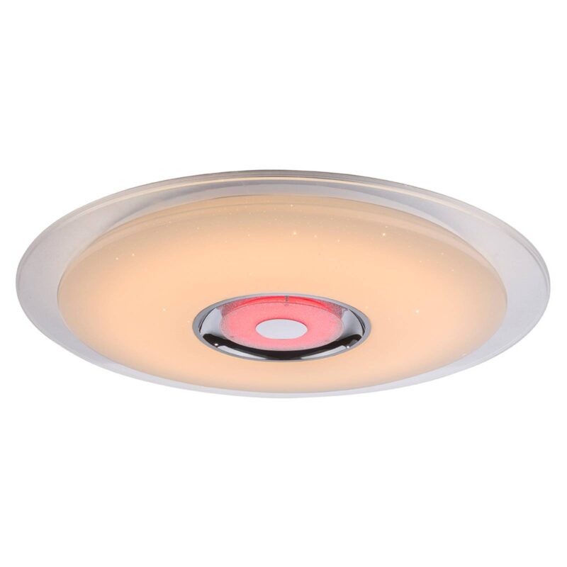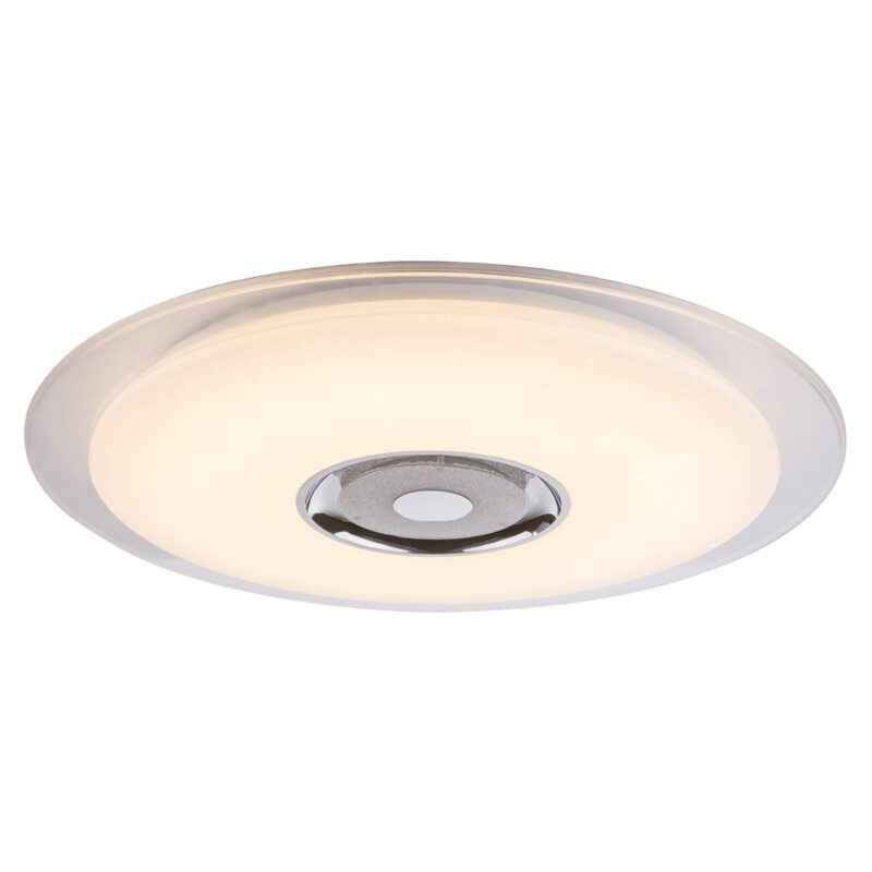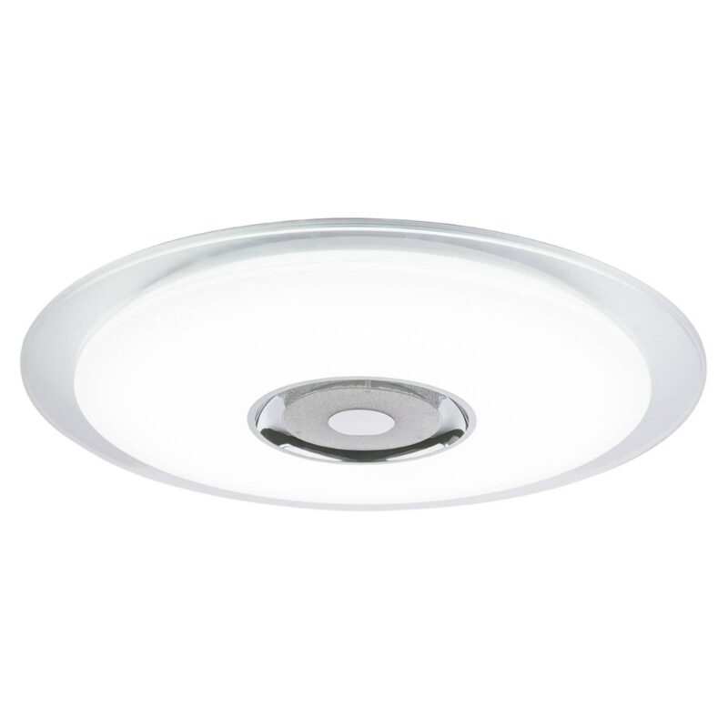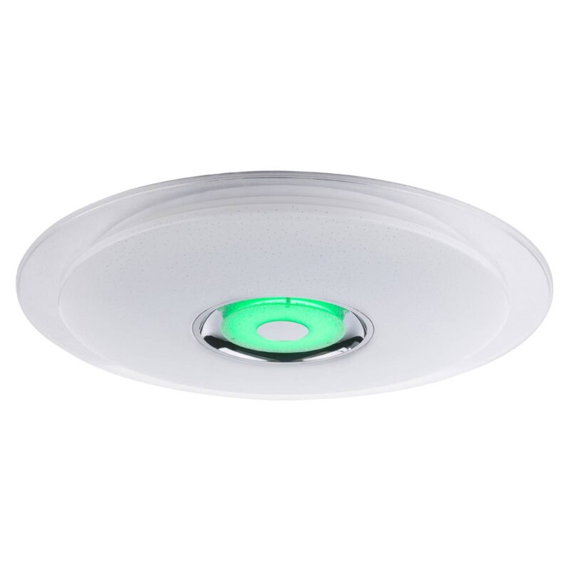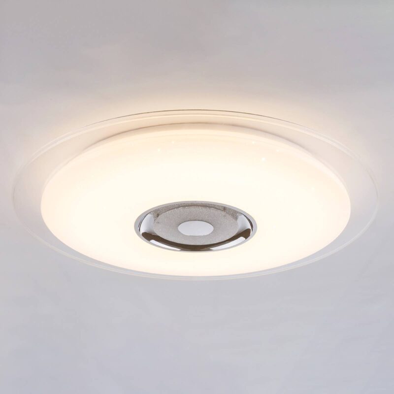 Trblietavé stropné LED svietidlo Tune s reproduktorom s Bluetooth Trblietavé tienidlo z akrylového skla stropného LED svietidla Tune so žiarivou dekoráciou je ozdobené množstvom krištáľov K5, ktoré sa pri zapnutom svetle nádherne ligocú. Na svietidle však je úžasné len jej trblietanie, ale aj množstvo funkcií: V strede svietidla sa nachádza výkonný reproduktor, ktorý možno spojiť prostredníctvom Bluetooth so zariadením na prehrávanie hudby. Ak pripojíte cez Bluetooth k lampe smartfón, môžete prostredníctvom aplikácie dostupnej pre iOS a Android svietidlo aj ovládať. LED RGB v strede svietidla tak môže svietiť jednou farbou alebo farby striedať. Prostredníctvom aplikácie môže svoju farbu meniť aj veľká LED jednotka. Na výber sú tri úrovne svetla, od teplej bielej až po denné svetlo. Okrem toho možno tlmiť jas svietidla. Priložený diaľkový ovládač takisto pokrýva všetky funkcie aplikácie na ovládanie osvetlenia.