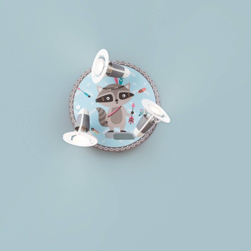 Indický vkus do detskej izby – stropné svietidlo Little Indians s mývalom Oskarom Stropné svietidlo Little Indians je okrúhle drevené svietidlo s tromi pohyblivými zdrojmi svetla. Motív vhodný pre deti zobrazuje mývala Oskara v indickom štýle, ktorý je zdobený perím a je na ňom znázornený šíp v ruke. Každý z troch svetelných bodov je vybavený dvojitým kĺbom a je možné ho flexibilne nastaviť tak, aby optimálne osvetlil každú miestnosť. Používajte žiarovky E14, ktoré nie sú súčasťou dodávky. Okrúhla lampa Little Indians je vyrobená z dreva a je možné ju tiež namontovať na stenu. Pekný motív, ktorý je vhodný pre deti, robí z lampy dekoratívny pútač očí v detskej izbe. Vyrobené v Nemecku.