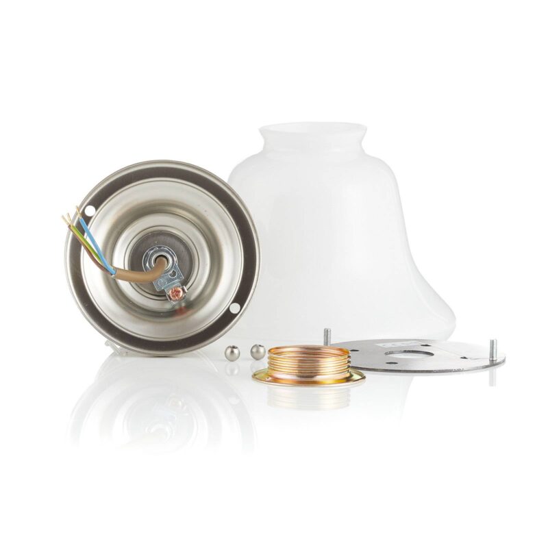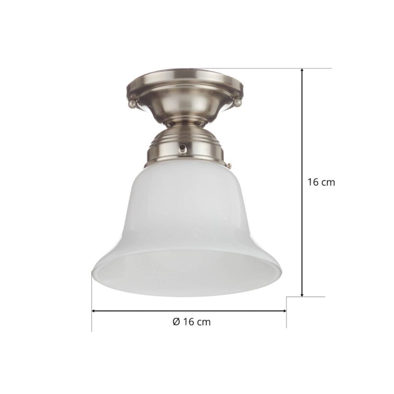 Atraktívne stropné svietidlo Alena s bielym skleneným tienidlomStropné svietidlo Alena má kovový záves vo farbe matného niklu a sklenené tienidlo v bielej farbe. Tvar svietidla pripomína obrátený kvet, ktorého kvet sa pri slnečnom svetle rozširuje. Vďaka svojmu krásnemu tvaru a moderným farbám si toto svietidlo nájde svoje miesto v mnohých rôznych miestnostiach a hodí sa k rôznym štýlom domácnosti.