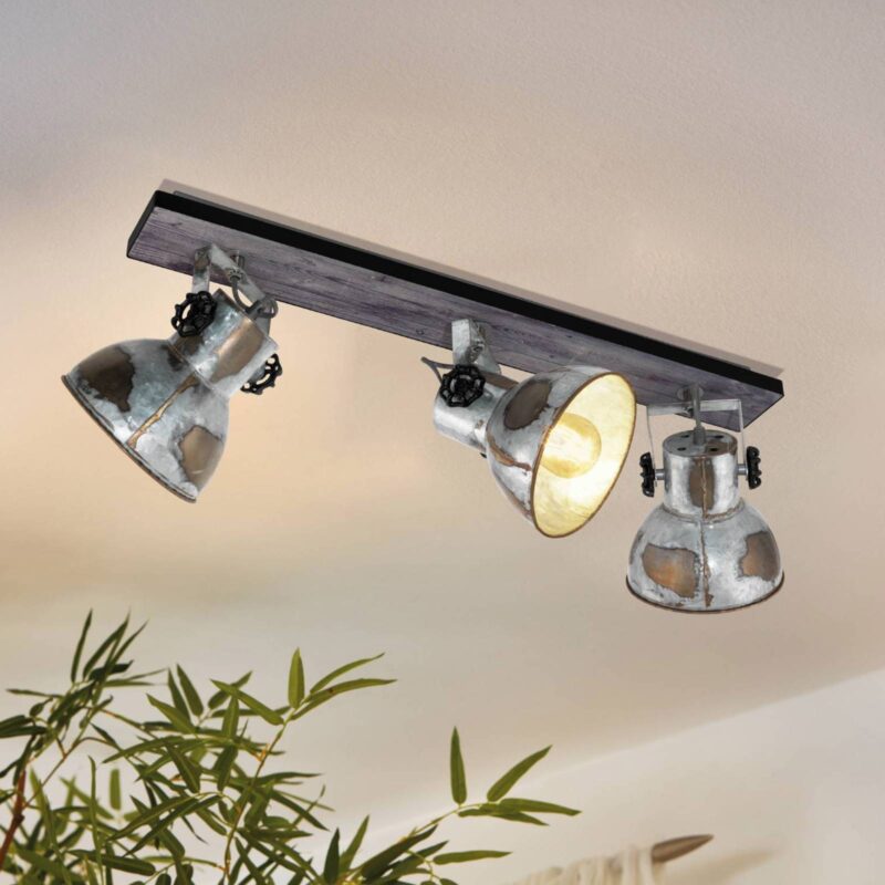 Stropné svietidlo Barnstaple s tromi zdrojmi svetla vo vintage vzhľade Stropné svietidlo Barnstaple s tromi zdrojmi svetla vyzerá, akoby pochádzalo z doby industrializácie na začiatku 20. storočia. Bolo vyrobené v autentickom vintage vzhľade a skladá sa z kovovej stropnej konzoly s tmavou drevenou doskou a troch oceľových tienidiel, ktoré majú ošúchaný zinkovaný vzhľad. Všetky tri reflektory je v držiakoch možné otočiť, pričom pomocou zaisťovacích skrutiek vpravo a vľavo možno prestaviť aj sklon zdrojov svetla a zaistiť ich v požadovanej polohe.