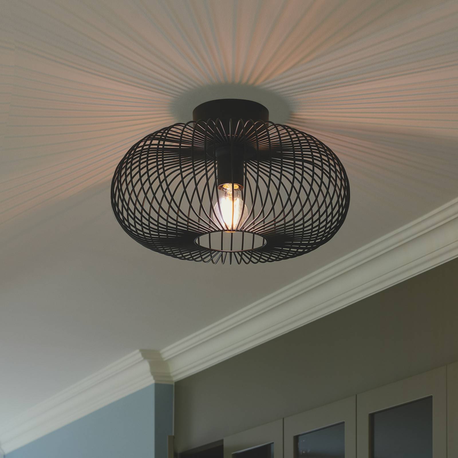 Stropné svietidlo Beroni s tienidlom z jemných kovových vzpier Guľovité, okrúhle tienidlo čierneho stropného svietidla Beroni sa skladá z mnohých jemných kovových vzpier. Svetelný zdroj (E27 – nie je súčasťou dodávky) sa nachádza v strede okrúhleho vrchnáka v objímke. V kombinácii s dekoratívnym svetelným zdrojom, napríklad so žiarovkou LED so vzhľadom vlákna, sa dosiahne krásny vzhľad a efektná hra svetla a tieňa.