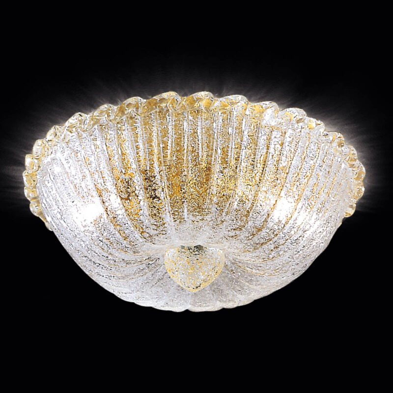 Stropné svietidlo Budino: vrchol z muránskeho skla a zlata – priemer 30 cmStropné svietidlo Budino, vyrobené výhradne z vysokokvalitného muránskeho skla, šíri žiarivo krásne svetlo na brilantné osvetlenie miestnosti. Čiastočne nanesené 24-karátové pozlátenie dodáva vyžarujúcemu svetlu brilantný lesk a vytvára v miestnosti výnimočnú atmosféru.
