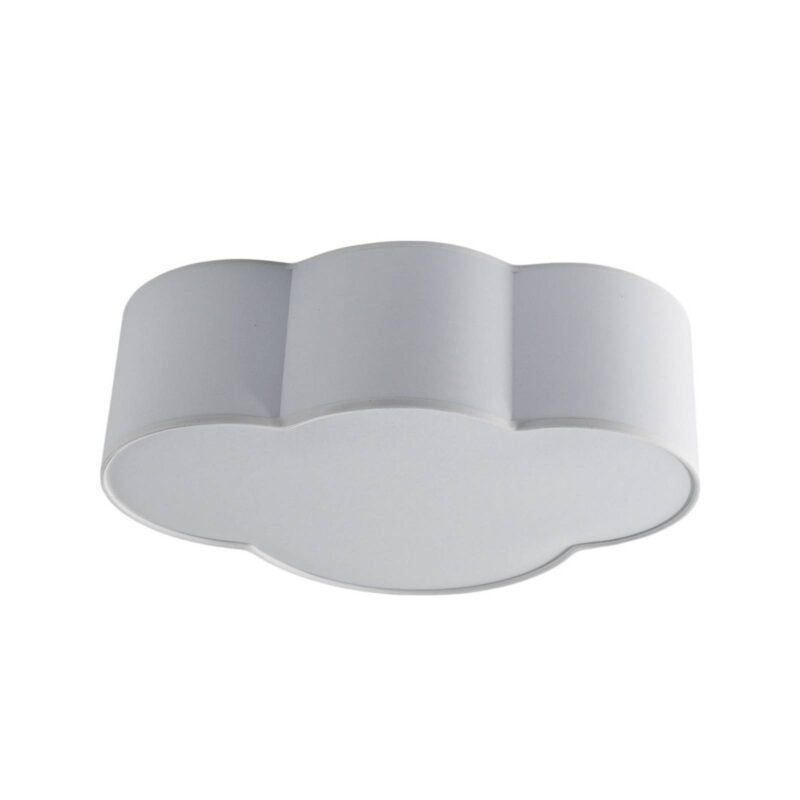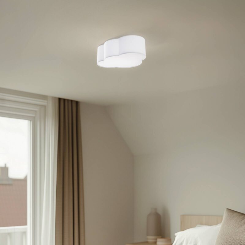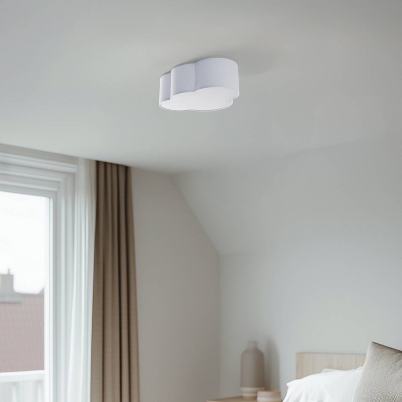 Stropné svietidlo Cloud z bielej tkaniny Stropné svietidlo Cloud má tvar štylizovaného oblaku, ako naznačuje jeho názov. Tienidlo je po stranách vyrobené z bielej tkaniny a na spodnej strane má biely difúzor. Cloud sa dá ideálne kombinovať s mladými nábytkovými konceptmi a je vhodnou voľbou aj do detských izieb.