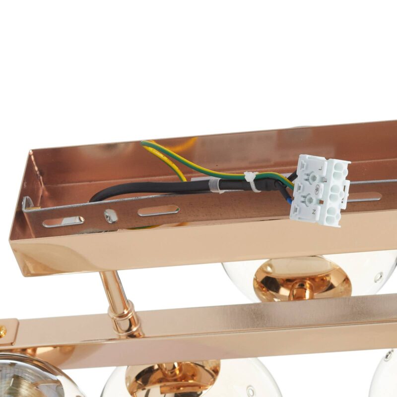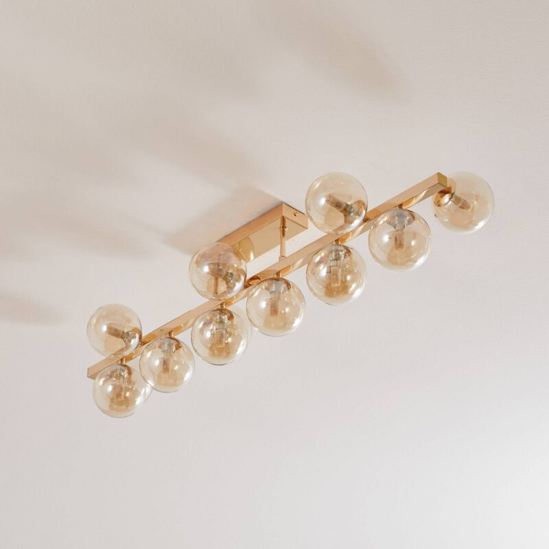 Stropné svetlo Dallas v zlatej farbe so sklenenými guľami pre fascinujúce svetelné okamihy Elegantné a neobvyklé – to je stropné svetlo Dallas. Skladá sa z predĺženej kovovej tyče, ku ktorej je pripevnených 13 samostatných tienidiel zo skla. Niektoré z nich sú hore a niektoré dole. To zaisťuje rovnomerné osvetlenie. Sklo má navyše svetlý jantárový odtieň, ktorý efektívne rozptyľuje svetlo do miestnosti. Farebnosť skla je doplnená lesklým zlatým povrchom rámu. Vďaka tomu vyzerá lampa obzvlášť elegantne.