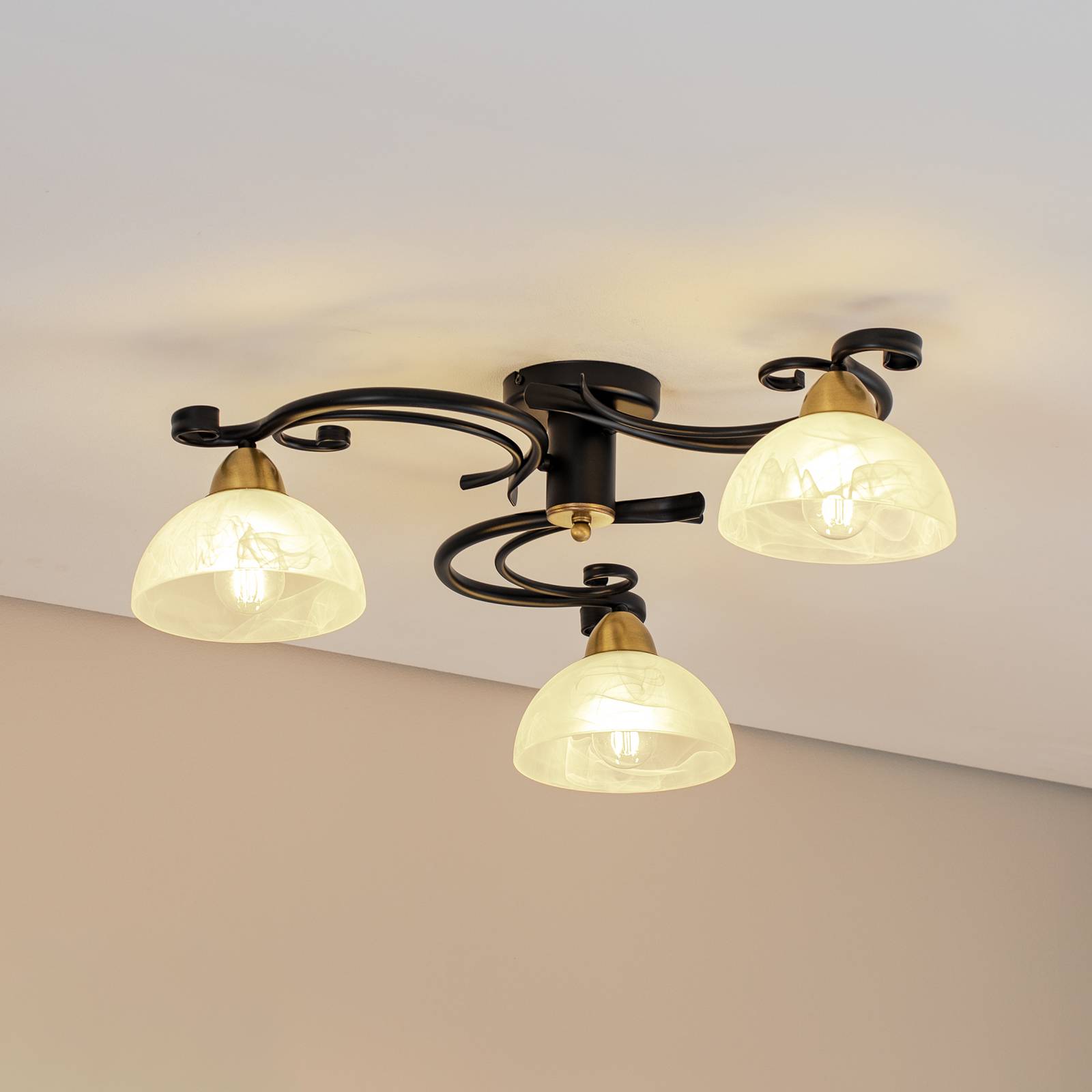 Stropné svietidlo Flora, 3 sklenené tienidlá, čierne/mosadzné