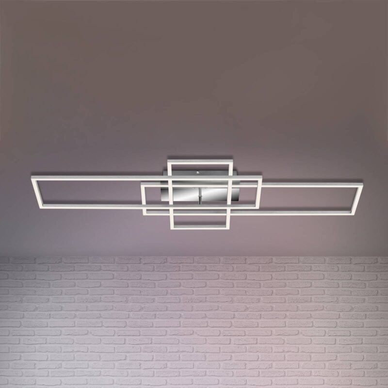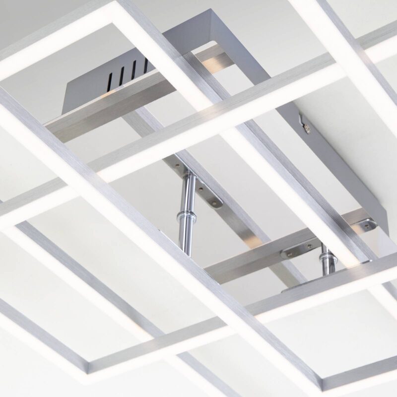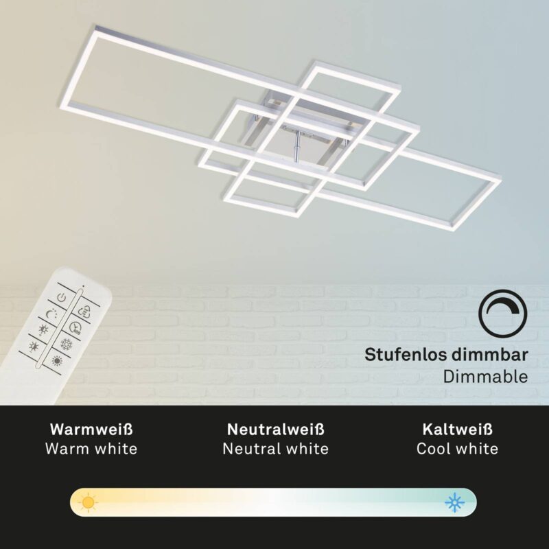 Stropné LED svietidlo Frame v hliníkovom a chrómovom vzhľade, vrátane diaľkového ovládania Vďaka špeciálnemu dizajnu tohto stropného LED svietidla Frame upúta pozornosť moderných interiérov. Tri prekrývajúce sa obdĺžnikové kovové rámy vytvárajú geometrickú celkovú štruktúru z jednoduchých základných tvarov. LED diódy sú integrované na spodnej strane rámov za satinovaným plastom a poskytujú veľkoplošné všeobecné osvetlenie. Okrem atraktívneho vzhľadu Frame zaujme aj praktickými funkciami, ktoré možno ovládať a aktivovať pomocou dodávaného diaľkového ovládania. Farbu svetla možno meniť od teplej po univerzálnu bielu a jas možno tiež prispôsobiť individuálnym potrebám. Okrem toho je k dispozícii funkcia časovača a nočného svetla.