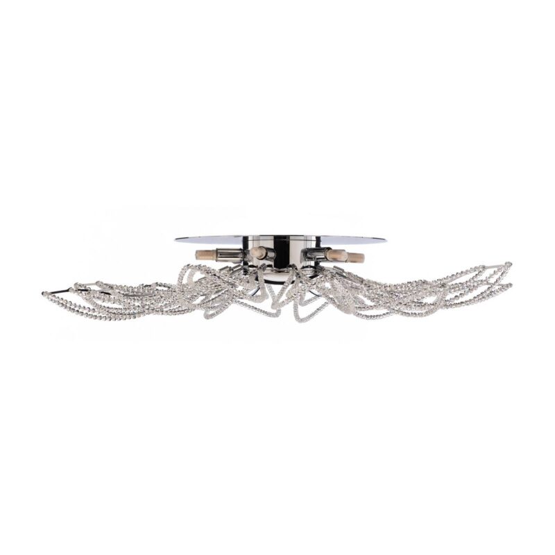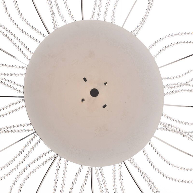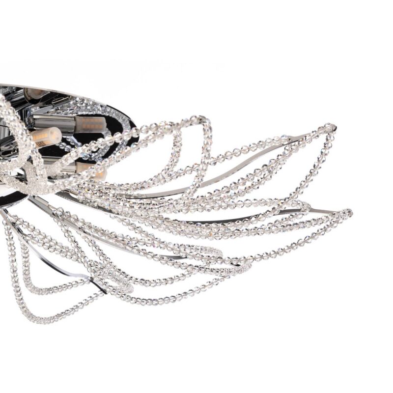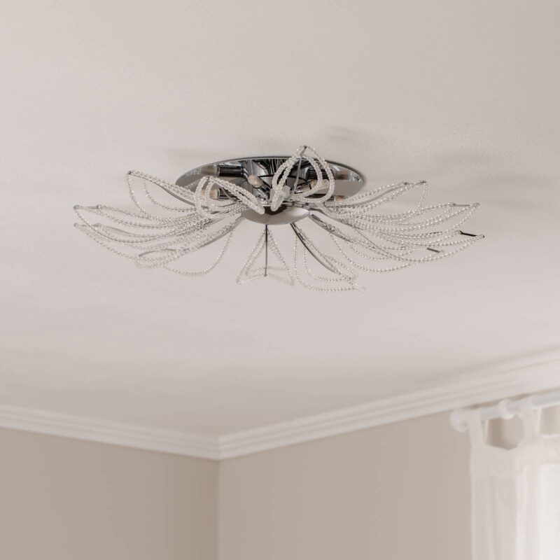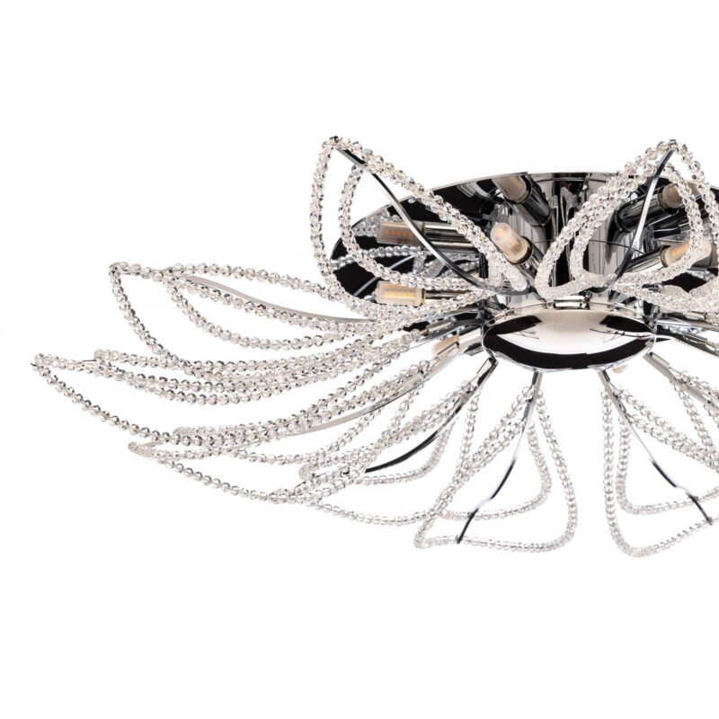 Chrómové stropné svietidlo Girasole s kryštálovou výzdobouPodstavec stropného svietidla Girasole je z lesklého chrómu a zdobený malými kryštálmi. Svietidlo Girasole, ktoré vyzerá ako veľký trblietavý kvet, poskytuje dobré všeobecné osvetlenie v každej obývačke a po vypnutí je aj ozdobou miestnosti.