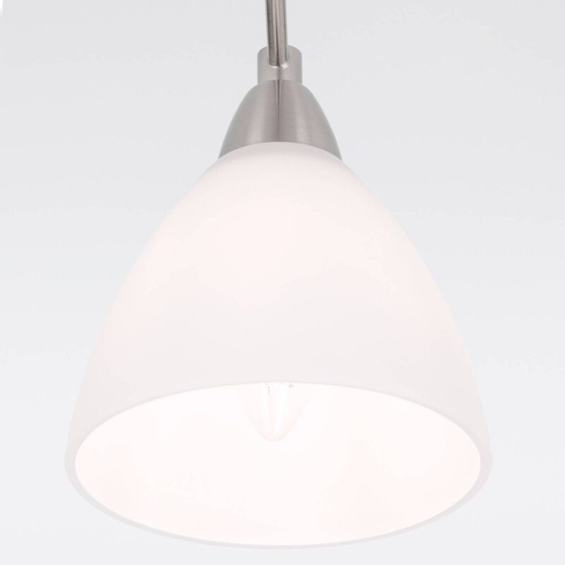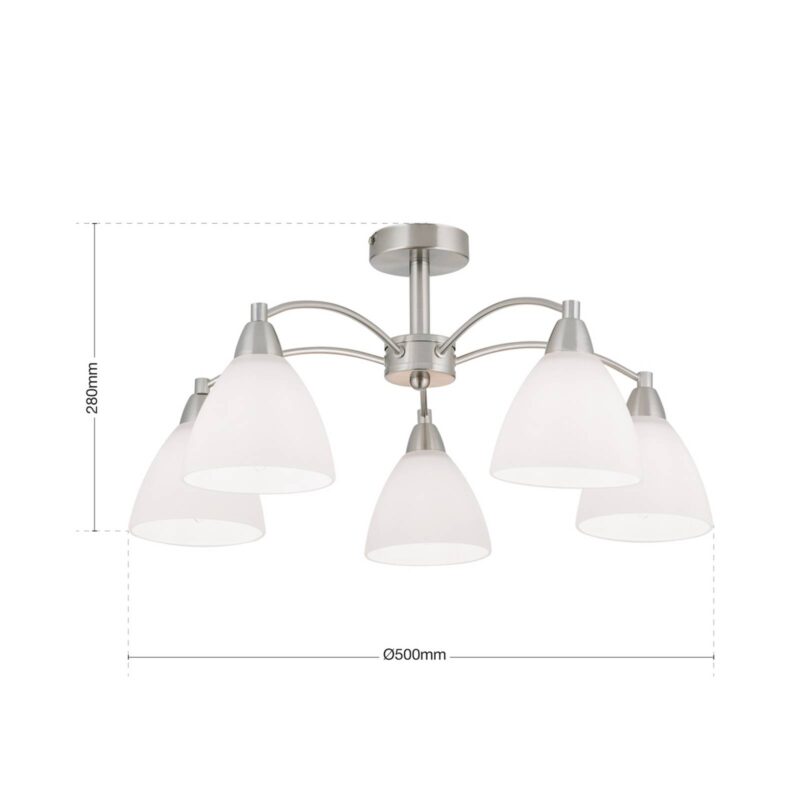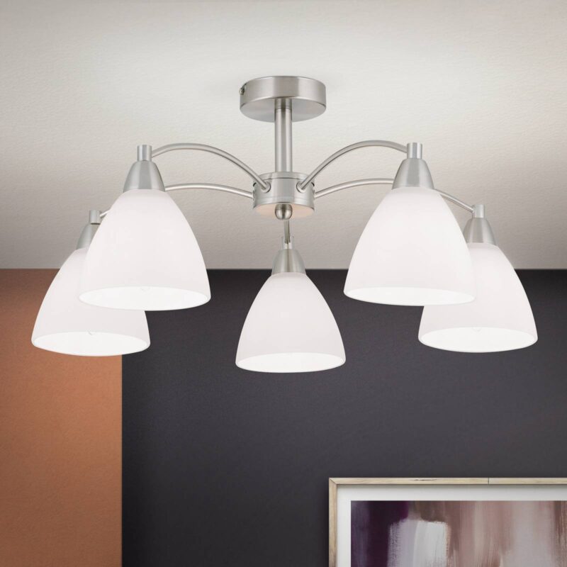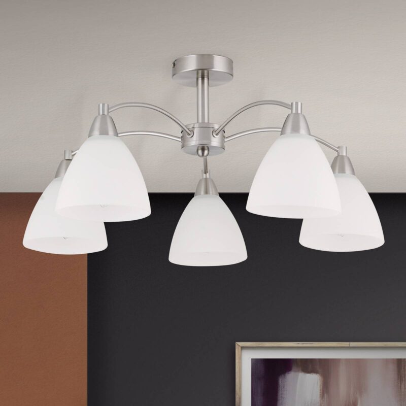 Pekne tvarované stropné svietidlo KINGA s bielymi satinovanými tienidlami Stropné svietidlo KINGA má päť žiaroviek, ktoré sú umiestnené na jednotlivých ranách a v strede pod stropným držiakom vnútri satinovaných tienidiel z opálového skla. Rozdelenie svetla pôsobí štýlovo, neoslepujúco a zároveň pohodlne.