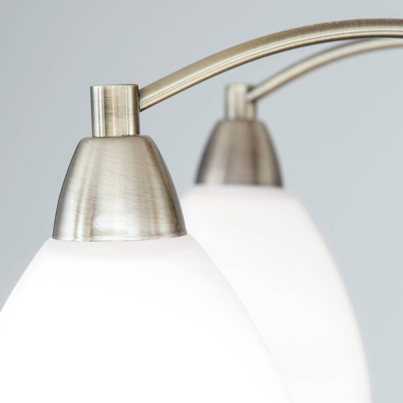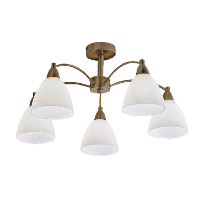 Kinga – štýlové stropné svietidlo so sklenenými tienidlami Stropné svietidlo Kinga je vybavené piatimi dole otvorenými tienidlami z jemne štruktúrovaného opálového skla. Aby sa predišlo oslneniu, tienidlá chránia svetlo zo strán, bez toho, že by svetlo strácalo jas, naopak zaisťujú priame osvetlenie jasných plôch. Sklenené tienidlá sú umiestnene na ramenách s klasickým povrchom v štýle starožitnej mosadze. Ich nadčasový dizajn robí z tohto stropného svietidla univerzálne použiteľný zdroj svetla, ktorý je možné zladiť so starožitným aj moderným zariadením.