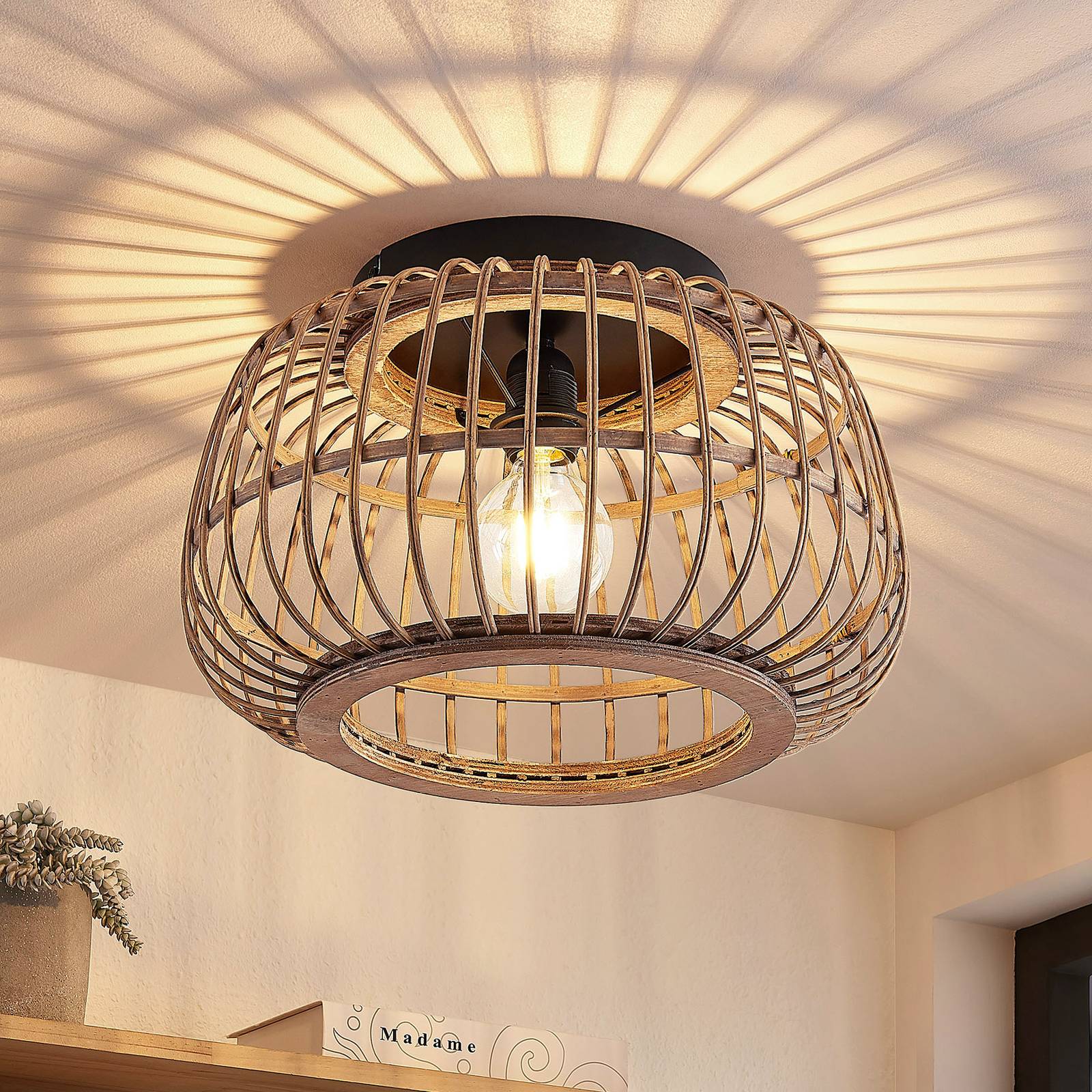 Stropné svietidlo Lindby Bominio, Ø 40 cm, ratan, drevo, E27