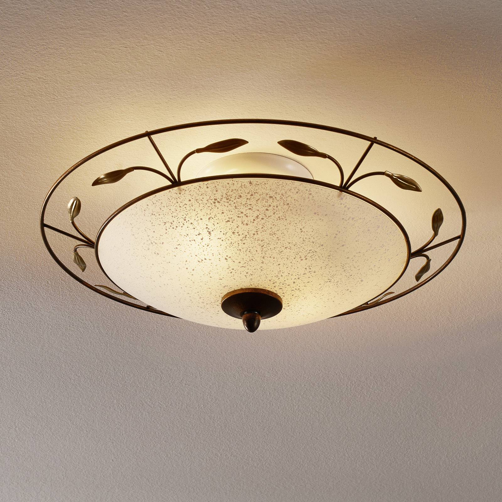 Dekoratívne stropné svietidlo Luca so sklom scavo a kvetinovým lemom pre útulné osvetlenie Vetvy, listy a kovový krúžok v starožitnej hnedej a zlatej farbe elegantne rámujú elegantné sklo scavo. Dekoratívne stropné svietidlo pre mnohé miestnosti a štýly zariadenia.