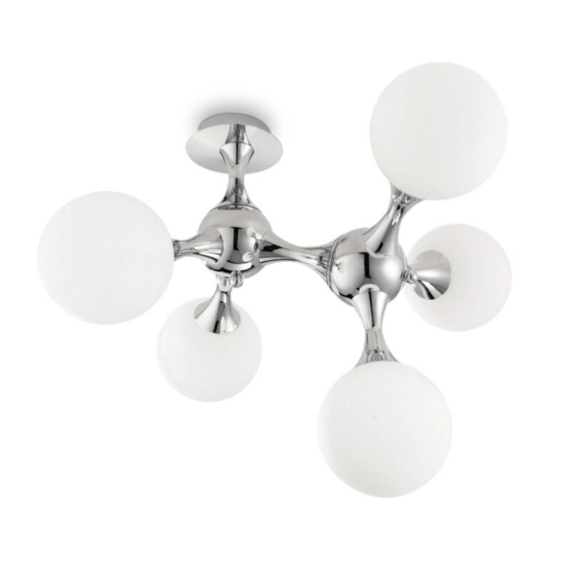 Stropné svietidlo Nodi Bianco s piatimi guľami z bieleho skla Stropné svetlo Nodi Bianco je brilantným osvetľovacím prvkom pre moderné štýly zariaďovania. Strieška a rám sú vyrobené z lesklého kovu chrómu, aby sa svetlo odrážalo. Spojovacie prvky rámu sa dajú navyše podľa potreby otáčať, čo umožňuje dáždniky podľa potreby zarovnať. Posledné menované sú vyrobené z fúkaného a leptaného skla, ktoré vyzerá ako biele. Svetlo z jednej žiarovky E14 na guľu je rovnomerne rozptýlené a vydáva príjemný tón. Izba je teda ponorená do útulnej atmosféry.