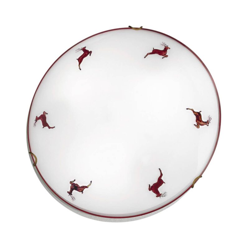 Oblé tvary a štýl vidieckeho domu – stropné svietidlo Nonna s dekorom jeleňa Dizajn stropného svietidla Nonna sa spočiatku javí ako veľmi jednoduchý a klasicky okrúhly. Hneď si jeden všimne nežného jeleňa, ktorý skáče za druhým ako v kruhu. Tento pekný dekor je ručne aplikovaný na ručne fúkané biele sklo a robí každú lampu jedinečnou. Sklenené tienidlo drží na svojom mieste tri spony zo starožitnej mosadze. Nonna svieti cez dve použiteľné žiarovky E27, ktoré svietia smerom dole matnou bielou farbou a preto sú slabo oslňujúce. Stropné svietidlo Nonna osvetľuje obývacie izby zariadené vo vidieckom štýle.