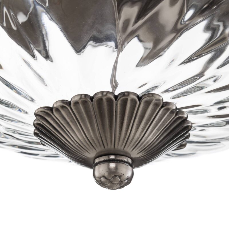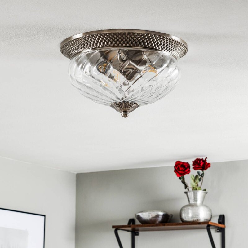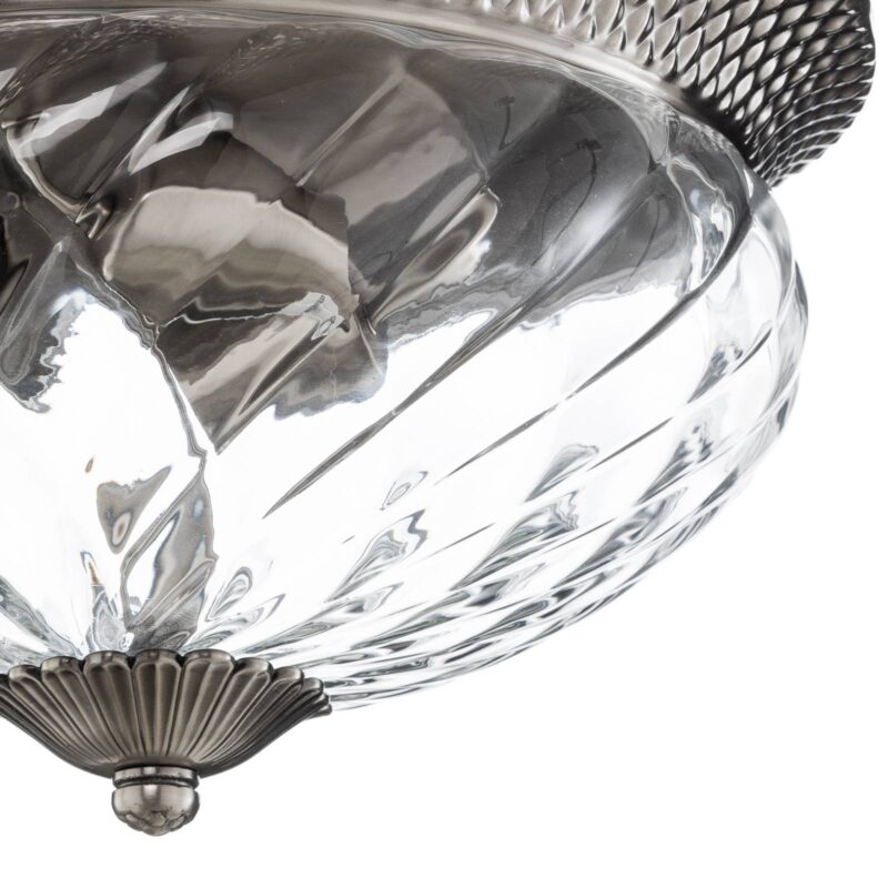 Plantážne stropné svietidlo – priemer 16 palcov Veľké stropné svietidlo Plantation je ideálne na dotvorenie životného prostredia v starožitnom štýle. tienidlo na lampu je vyrobené z atraktívne štruktúrovaného, číreho skla, vzor štruktúry vytvára efektný svetelný efekt. Kovové časti stropného svietidla Plantation boli spracované so starožitným niklovým povrchom a potom vyleštené. Brilantný zdroj svetla, ktorý poskytuje dostatočné osvetlenie miestnosti a je výhodou pre každý obývací priestor v starožitnom štýle.