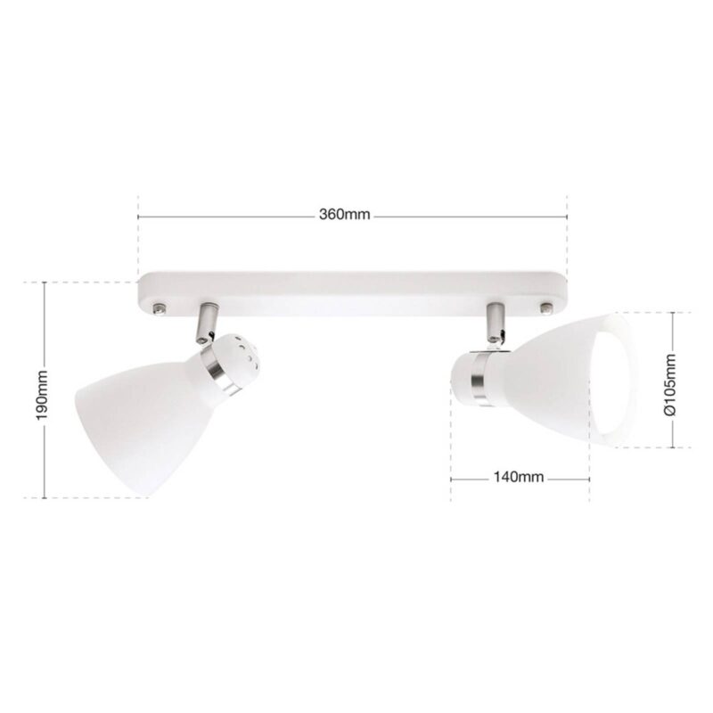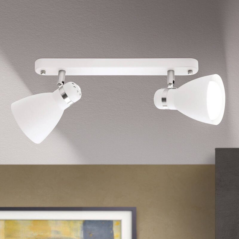 Dvojsvetelný školský stropný reflektor – hlavy svietidiel sa dajú individuálne nastaviť Moderný vzhľad robí z dvojlampového stropného reflektora School nepostrádateľný osvetľovací objekt pre moderné obývacie izby a chodby. Je vyrobený z lakovanej ocele, dve hlavy svietidla sa dajú otáčať a umožňujú tak individuálne určovať smer svetla. Tým sa vytvorí nielen dostatočné celkové osvetlenie, ale možno vhodne osvetliť aj tmavé kúty miestnosti. Vzhľad ešte viac zvýrazňuje pochrómovaný krúžok v každej objímke. – externe stmievateľné