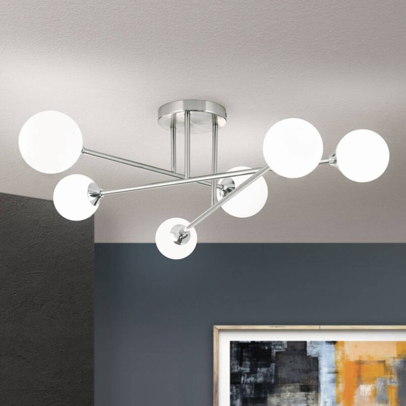 Snehobiele stropné svietidlo s filigránovou tyčou a šiestimi sklenenými guľami Toto stropné svietidlo sa nazýva Snowwhite (snehobiele), pretože má šesť opálovo bielych sklenených tienidiel v tvare gule. Tie sa nachádzajú na vonkajších koncoch troch pretínajúcich sa kovových tyčí. Pomerne veľké stropné svietidlo je preto vhodné najmä do väčších miestností – obývačiek alebo spální. Opálovo biele sklo umožňuje vyžarovať svetlo bez oslnenia a veľmi rovnomerne do všetkých smerov. Pomocou stmievateľných žiaroviek a existujúceho stmievača je možné svetlo stlmiť. Žiarovky nie sú súčasťou dodávky.