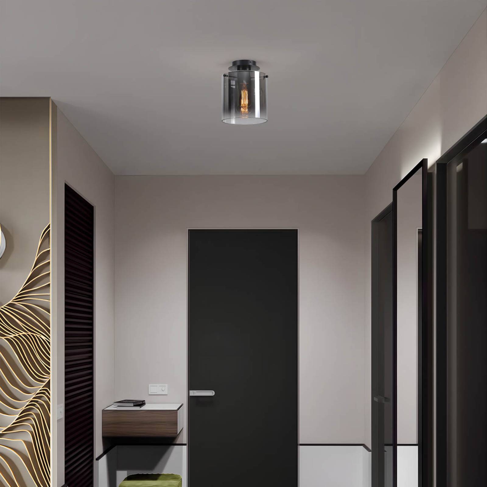 Štýlové stropné svietidlo Sweden s tónovaným skleneným tienidlom Stropné svietidlo Sweden s jedným plameňom v kombinácii ocele a skla a valcovým tvarom prináša do obývacích izieb alebo chodieb nadčasovú estetiku a pri samostatnom použití alebo použití viacerých svietidiel ich skvele osvetľuje. Dokonale zladená farebná kombinácia lakovaného oceľového rámu a tónovaného skleneného tienidla tvorí harmonický celok a vytvára príjemné vyžarovanie svetla. Vďaka pätici E27 ponúka toto svietidlo flexibilitu pri výbere svetelného zdroja, takže možno vytvárať individuálne svetelné nálady.