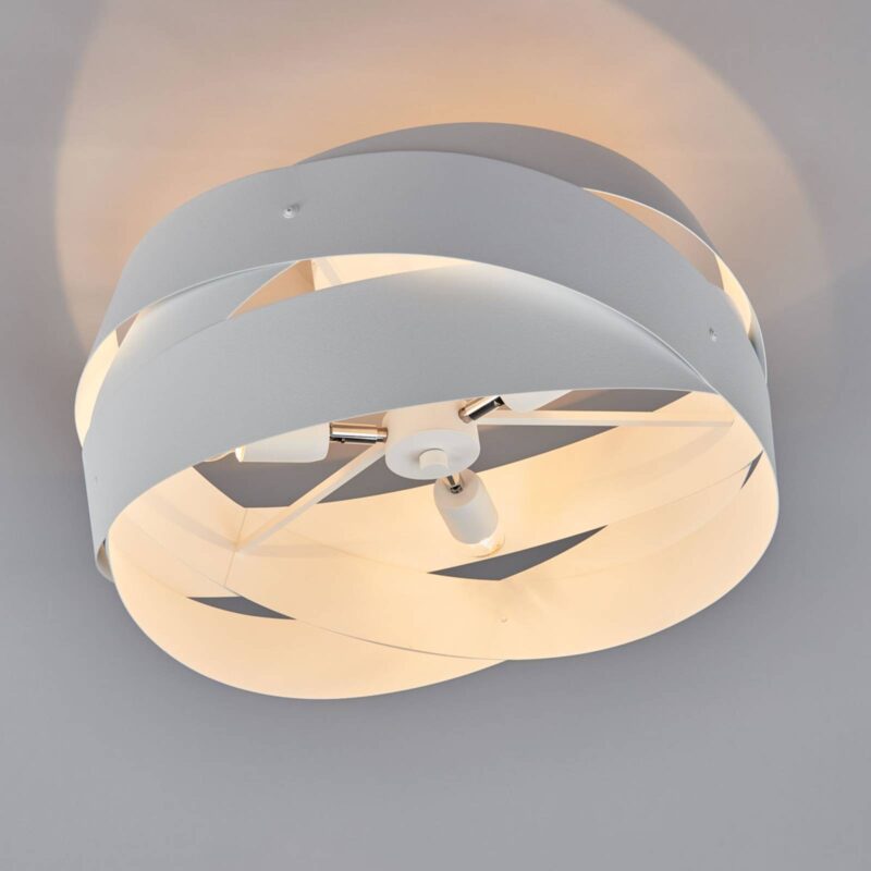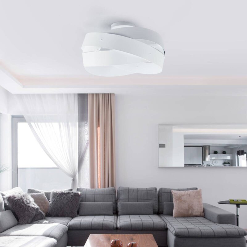 Veľké stropné svietidlo Tornado v nadčasovej bielej farbe Ak chcete svojej obytnej miestnosti prepožičať moderný, ale súčasne dynamický nádych, môžete ho pomocou stropného svietidla Tornado dosiahnuť v maximálnej miere. Pozostáva z viacvrstvových kovových pásikov, ktoré sa energicky ovíjajú okolo stredu svietidla a sú pokryté nadčasovou bielou povrchovou úpravou. Otvorené smerom nadol je svetlo prekrásne harmonicky vyžarované z tienidla na lampu.