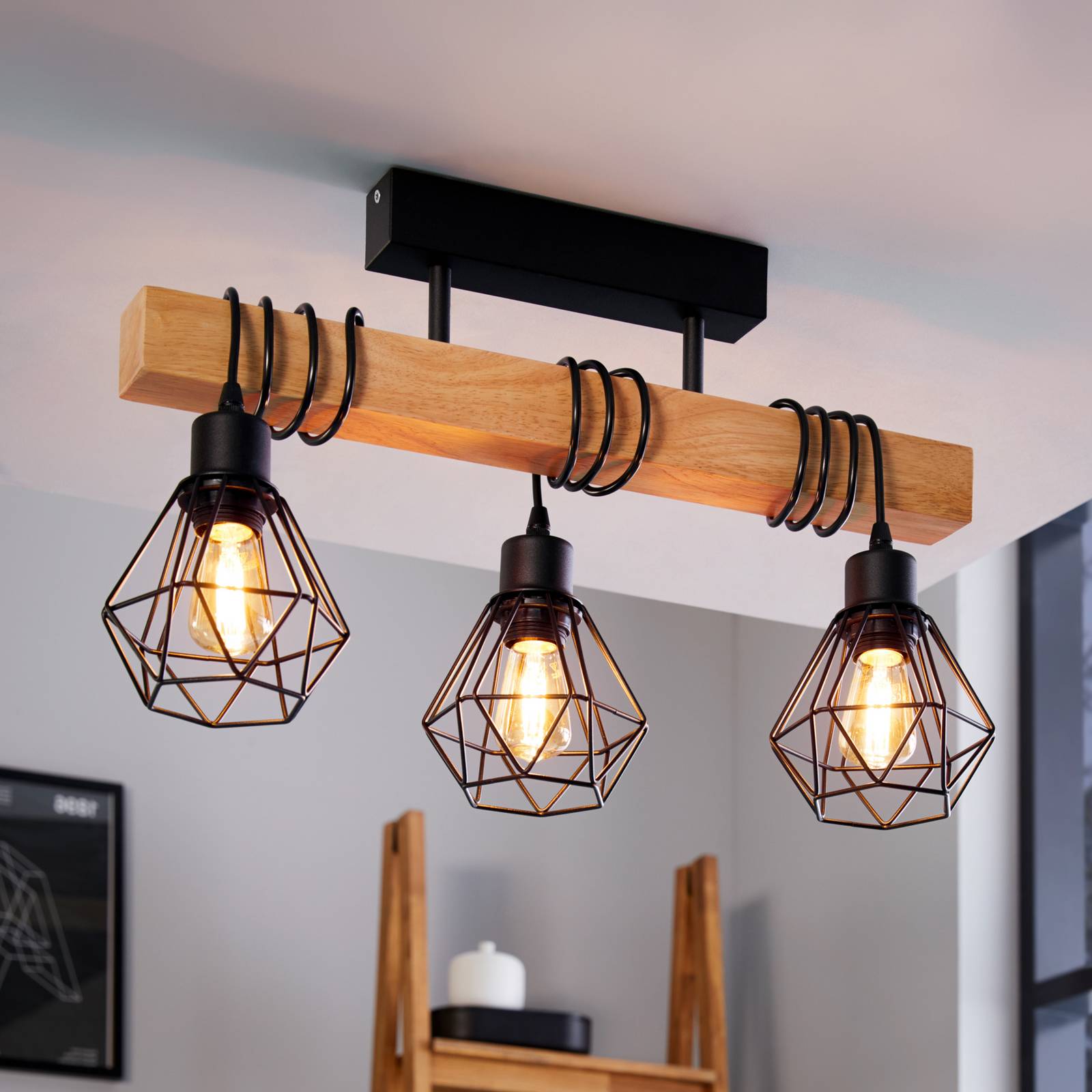 Stropné svietidlo Townshend 5 v čiernom a drevenom vzhľade Toto ušľachtilé stropné svietidlo pochádza od renomovaného výrobcu osvetlenia Eglo. Townshend 5 kombinuje moderný dizajn s udržateľnými materiálmi a vďaka svojej jednoduchej konštrukcii sa hodí do mnohých prostredí. Jednotlivé svetelné zdroje je možné vložiť do troch elegantných klietkových odtieňov modelu Townshend 5. Dáždniky visia na ich kábloch, ktoré sú obalené okolo rustikálneho dreveného prvku. Ostatné komponenty sú vyrobené z robustnej ocele v klasickej čiernej farbe. Zdržanlivý dizajn a kompaktná konštrukcia stropného svietidla umožňujú jeho integráciu do najrôznejších svetelných konceptov.