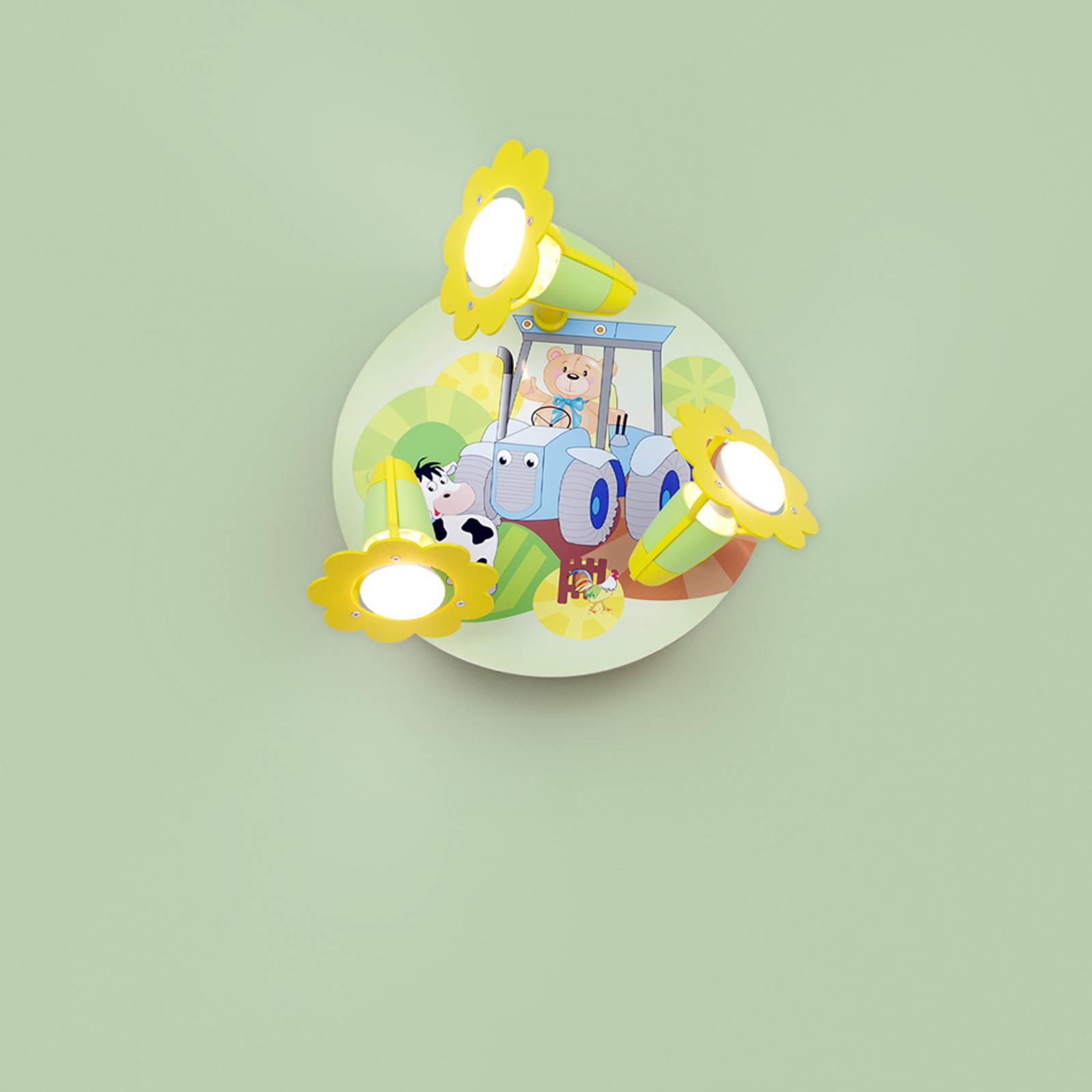 Stropné svietidlo Traktor s veselým motívom farmy sa hodí do každej detskej izby. Na farme sa vždy niečo deje. Aj malý medvedík, veselá krava a usilovný traktor majú čo povedať. Priateľský detský motív robí stropné svietidlo Traktor spolu s otočnými bodovými svetlami ideálnym riešením osvetlenia detskej izby. Svietidlo do detskej izby Traktor je vyrobené prevažne z dreva a nalakované farbami neobsahujúcimi rozpúšťadlá na báze vody. Tri žiarovky nie sú súčasťou dodávky, a preto musia byť objednané zvlášť.