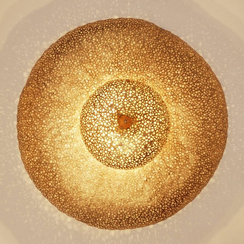 Stropné svietidlo UTOPISTICO – žiarivo žiariaci pútač pohľadovStropné svietidlo UTOPISTICO s extravagantným dizajnom zaujme okrúhlym tienidlom zlatej farby vyrobeným zo železa, ktoré má krásny vzor. Svetelný zdroj v strede vytvára nádherné svetelné efekty. Stropné svietidlo možno integrovať do mnohých obytných priestorov.